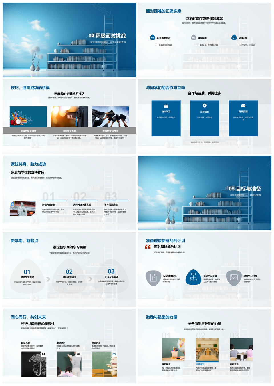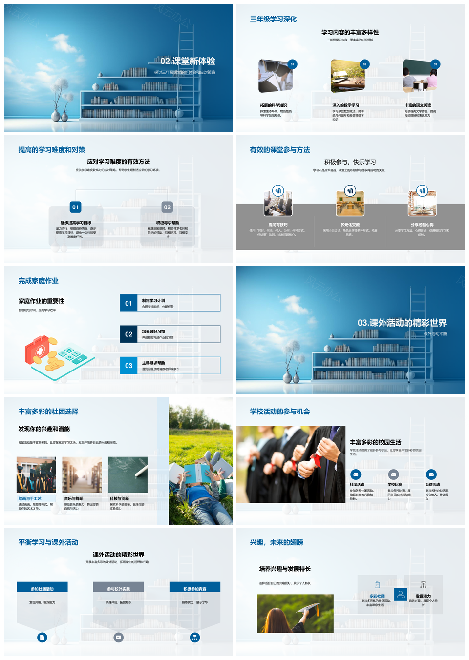 三年级升级学习挑战机遇课堂作业社团书PPT模板推荐
