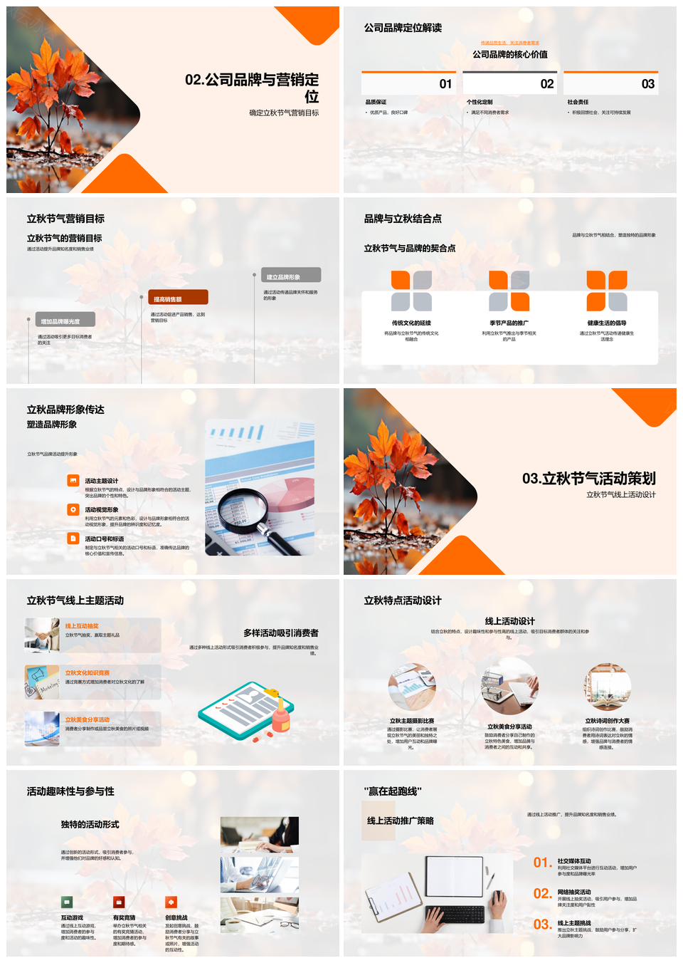 这是一张立秋品牌活动秋叶创意策划提升消费体验PPT模板,包含立秋、品牌活动、秋叶、创意策划、消费体验等主题内容,也可用作品牌活动秋叶创意、活动秋叶创意策划、秋叶创意策划提升、创意策划提升消费、策划提升消费体验、品牌活动创意策划、立秋品牌活动创意、立秋品牌活动、品牌活动创意、活动秋叶创意、秋叶创意策划、创意策划消费、策划提升消费、提升消费体验、消费体验等PPT场景使用。 风云办公提供的立秋品牌活动秋叶创意策划提升消费体验PPT模板,下载格式为pptx,一共28页,作品中文字及图均可以修改和编辑,图片更改请在作品中右键图片并更换,文字修改请直接点击文字进行修改。
