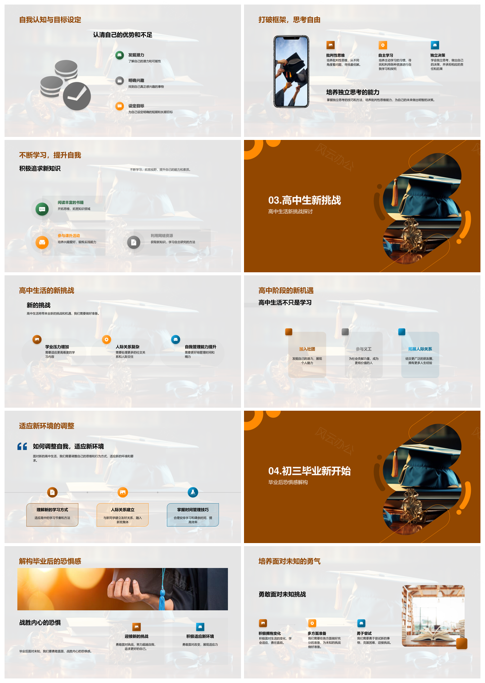 风云办公提供的初三毕业启程成长立标高中思行新挑战PPT模板,下载格式为pptx,一共24页,作品中文字及图均可以修改和编辑,图片更改请在作品中右键图片并更换,文字修改请直接点击文字进行修改。