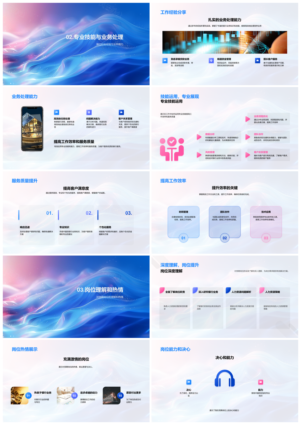 这是一张银行岗位竞聘述职专业技能实践经验业务理解效率服务岗位理解PPT模板,包含银行、岗位、竞聘、述职、专业技能、实践经验、业务理解、效率、服务、岗位理解等主题内容,也可用作银行岗位竞聘述职、竞聘述职专业技能实践经验、专业技能实践经验业务理解、实践经验业务理解效率服务、业务理解效率服务岗位理解、银行岗位竞聘、岗位竞聘述职、竞聘述职专业技能、述职专业技能实践经验、专业技能实践经验业务理解、实践经验业务理解效率、业务理解效率服务、效率服务岗位理解、银行岗位、岗位竞聘、竞聘述职等PPT场景使用。 风云办公提供的银行岗位竞聘述职专业技能实践经验业务理解效率服务岗位理解PPT模板,下载格式为pptx,一共28页,作品中文字及图均可以修改和编辑,图片更改请在作品中右键图片并更换,文字修改请直接点击文字进行修改。