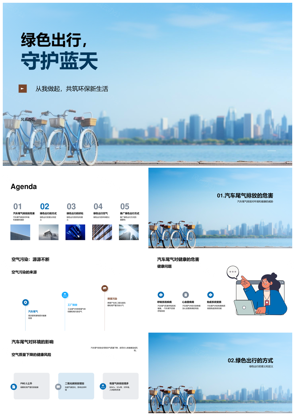 风云办公提供的初中生骑行减尾气护城市蓝天PPT模板,下载格式为pptx,一共24页,作品中文字及图均可以修改和编辑,图片更改请在作品中右键图片并更换,文字修改请直接点击文字进行修改。