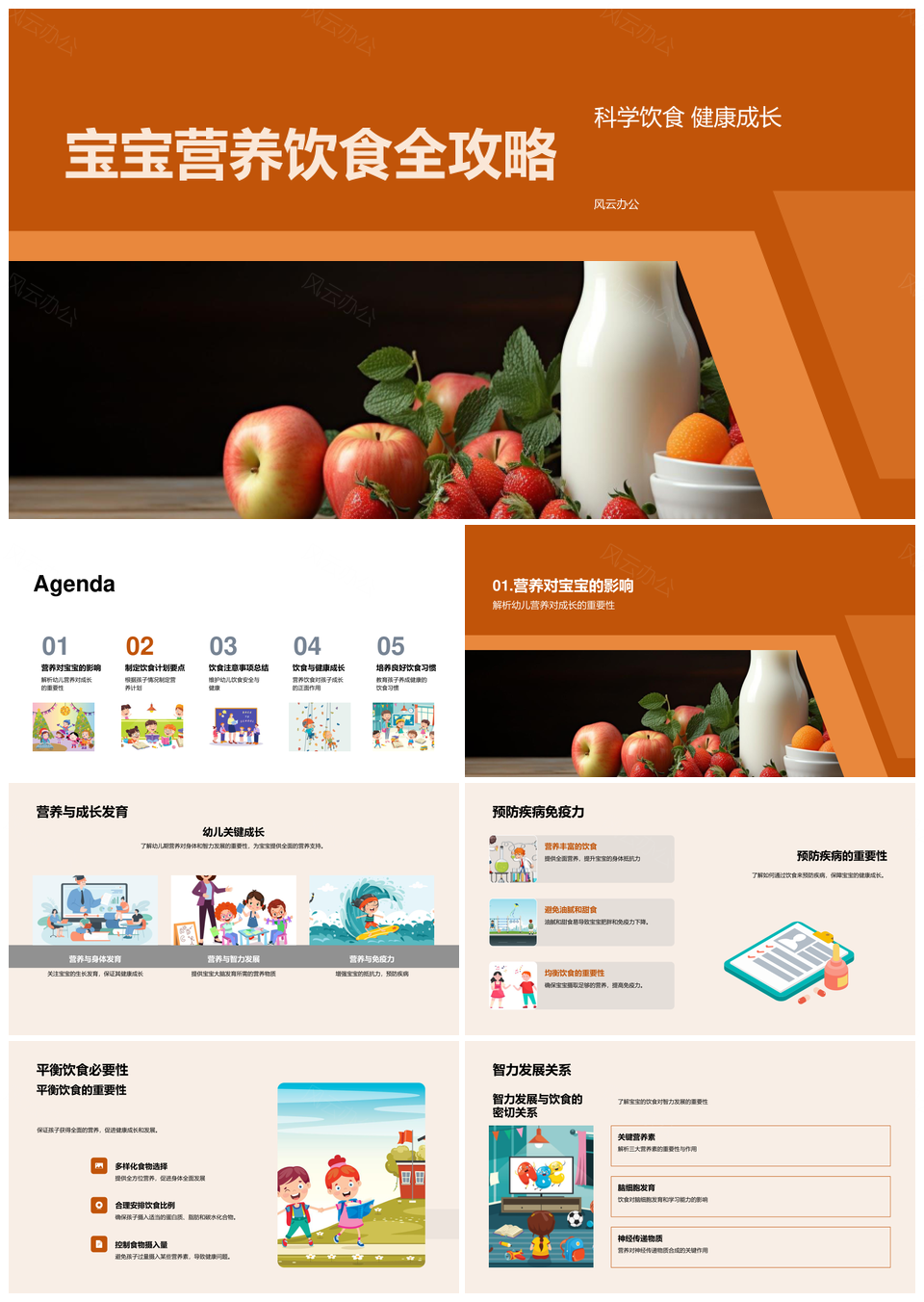 风云办公提供的幼儿营养饮食卫生促发育强免疫计划PPT模板,下载格式为pptx,一共33页,作品中文字及图均可以修改和编辑,图片更改请在作品中右键图片并更换,文字修改请直接点击文字进行修改。