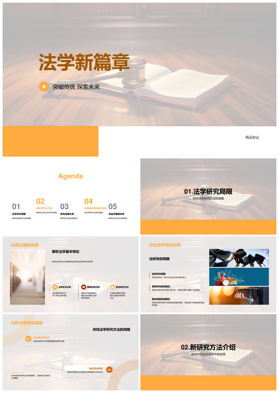 风云办公提供的法学新篇传统局限突破新域探析PPT模板,下载格式为pptx,一共23页,作品中文字及图均可以修改和编辑,图片更改请在作品中右键图片并更换,文字修改请直接点击文字进行修改。
