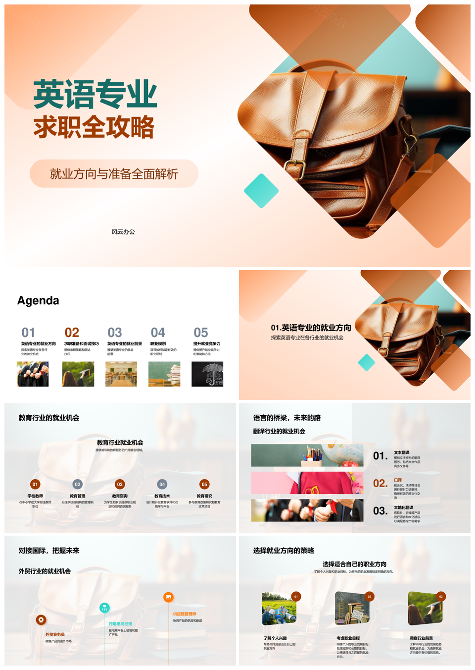 这是一张英语专业求职攻略教育翻译外贸方向规划前景PPT模板,包含英语专业、求职攻略、教育、翻译、外贸方向、规划、前景等主题内容,也可用作英语专业求职攻略教育、英语专业教育翻译外贸、求职攻略教育翻译、攻略教育翻译外贸、教育翻译外贸方向、翻译外贸方向规划、外贸方向规划前景、英语专业求职攻略、求职攻略教育翻译、攻略教育翻译外贸、教育翻译外贸方向、翻译外贸方向规划、外贸方向规划前景、英语专业教育翻译、教育翻译外贸方向等PPT场景使用。 风云办公提供的英语专业求职攻略教育翻译外贸方向规划前景PPT模板,下载格式为pptx,一共25页,作品中文字及图均可以修改和编辑,图片更改请在作品中右键图片并更换,文字修改请直接点击文字进行修改。