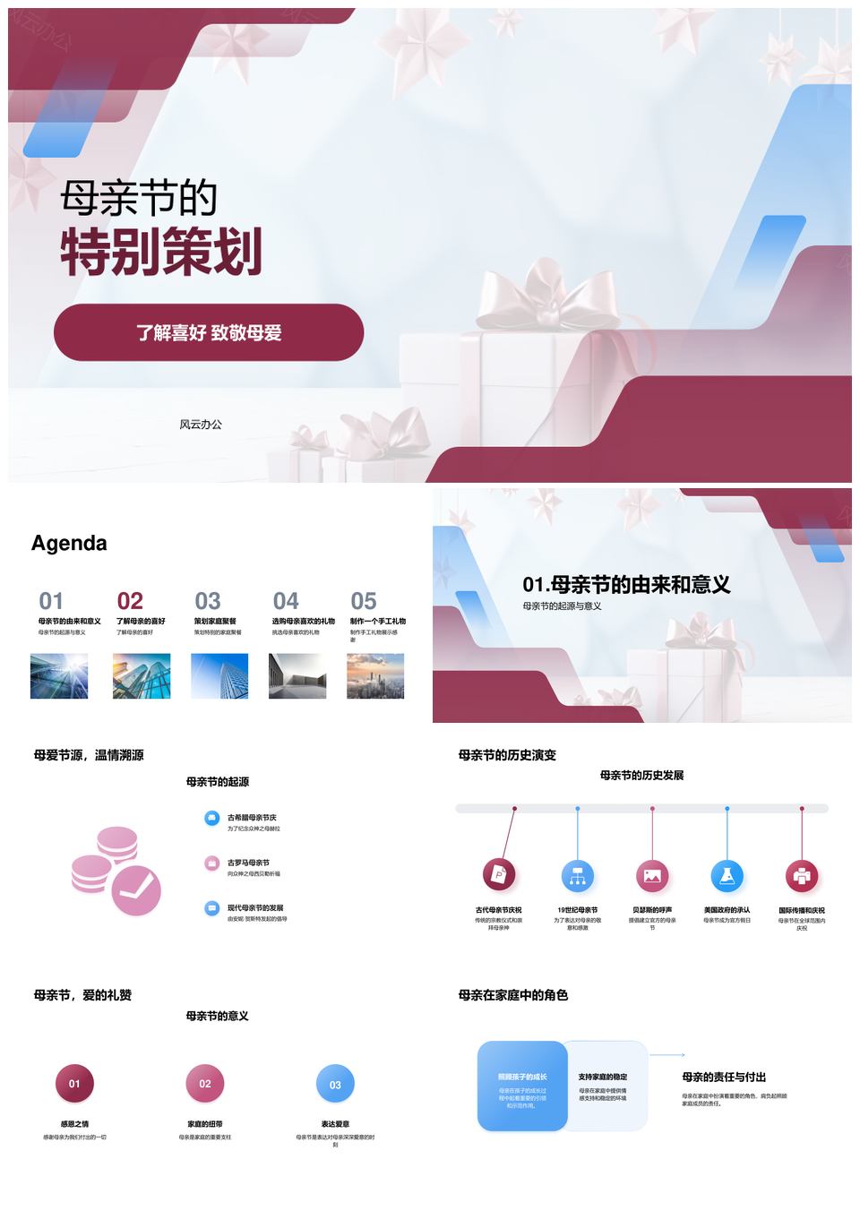 风云办公提供的母亲节家宴花束相册记录母爱责任PPT模板,下载格式为pptx,一共28页,作品中文字及图均可以修改和编辑,图片更改请在作品中右键图片并更换,文字修改请直接点击文字进行修改。