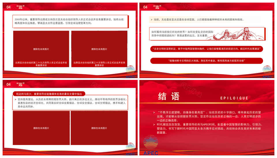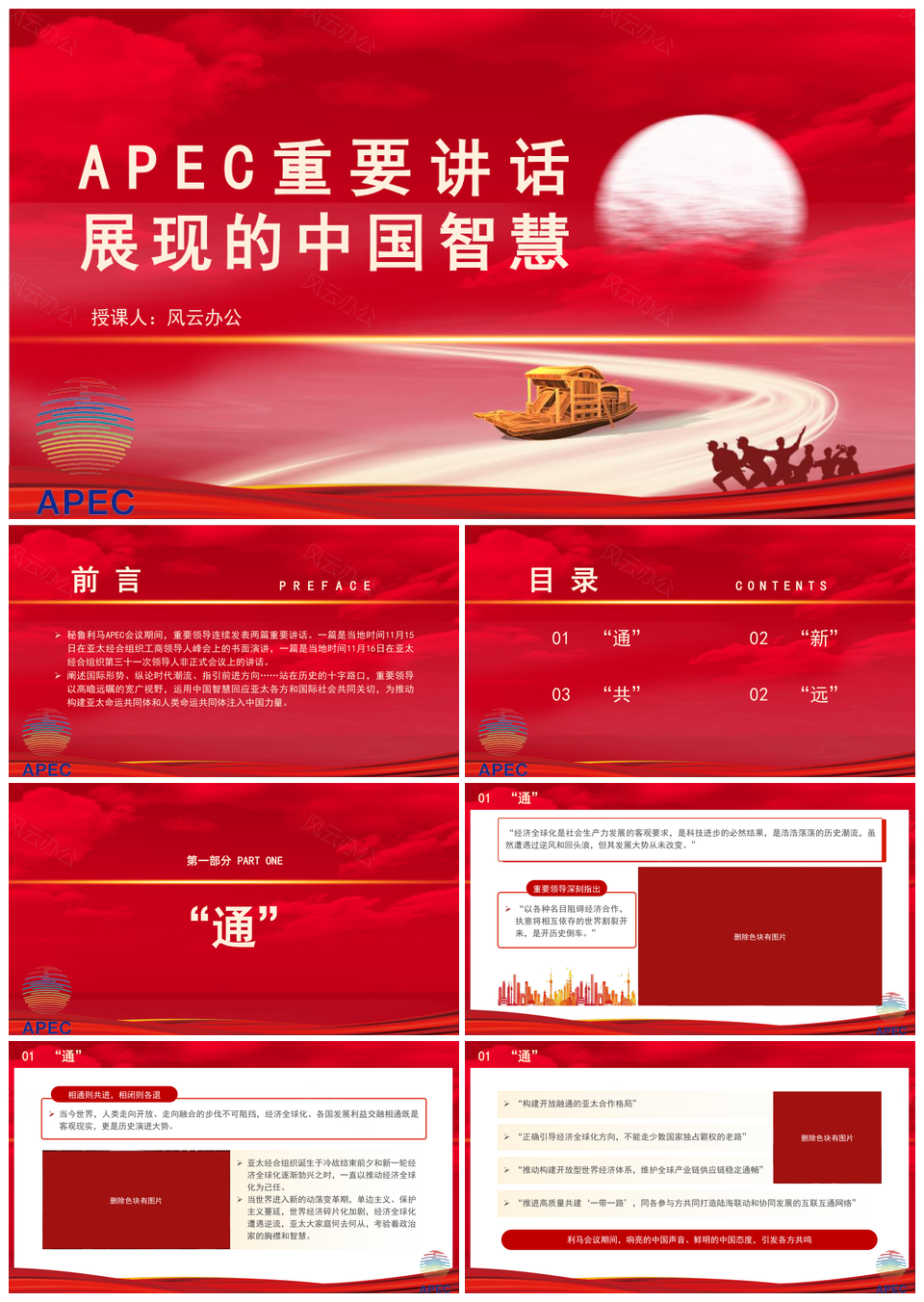 这是一张重要领导APEC重要讲话中国智慧专题党课PPT模板,包含重要、领导、APEC、重要讲话、中国智慧、专题、党课等主题内容,也可用作重要领导APEC讲话、领导APEC重要讲话、中国智慧专题党课、重要领导APEC、APEC重要讲话、中国智慧专题、重要领导讲话、APEC中国智慧、重要领导、领导APEC、APEC重要、重要讲话、中国智慧、智慧专题、专题党课等PPT场景使用。 风云办公提供的重要领导APEC重要讲话中国智慧专题党课PPT模板,下载格式为pptx,一共22页,作品中文字及图均可以修改和编辑,图片更改请在作品中右键图片并更换,文字修改请直接点击文字进行修改。