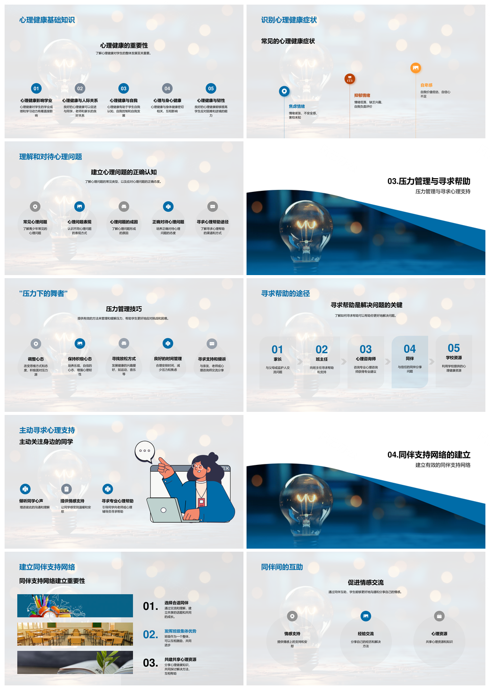 风云办公提供的心理健康同行互助共建和谐校园PPT模板,下载格式为pptx,一共25页,作品中文字及图均可以修改和编辑,图片更改请在作品中右键图片并更换,文字修改请直接点击文字进行修改。