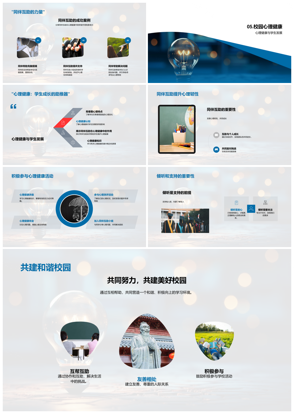 这是一张心理健康同行互助共建和谐校园PPT模板,包含心理健康、同行、互助、共建、和谐校园等主题内容,也可用作心理健康同行互助共建、同行互助共建和谐、互助共建和谐校园、心理健康同行互助、同行互助共建、互助共建和谐、共建和谐校园、心理健康同行、同行互助、互助共建、共建和谐、和谐校园、心理健康互助、同行和谐校园、共建校园等PPT场景使用。
