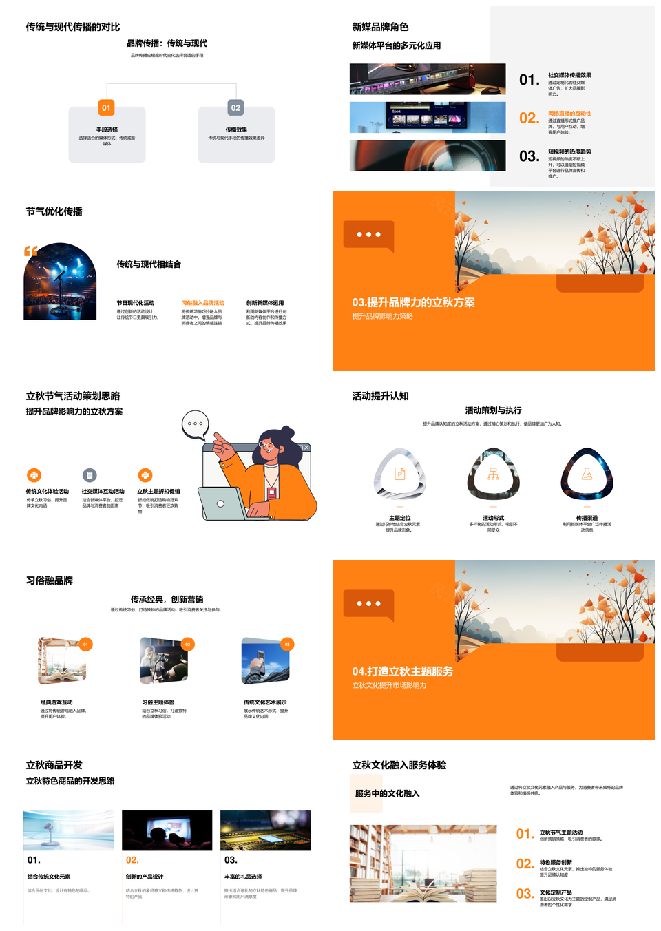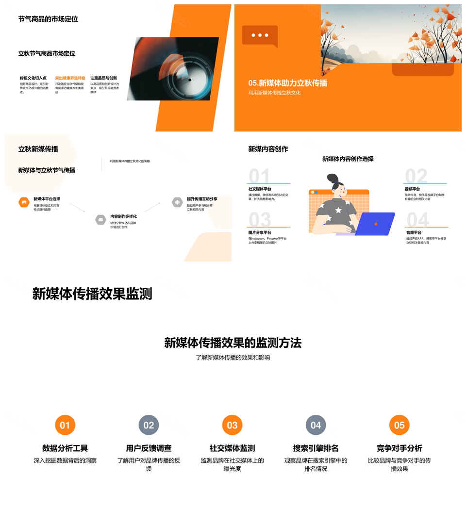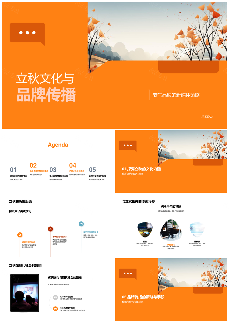 风云办公提供的立秋文化节气品牌新媒体传播策略PPT模板,下载格式为pptx,一共23页,作品中文字及图均可以修改和编辑,图片更改请在作品中右键图片并更换,文字修改请直接点击文字进行修改。