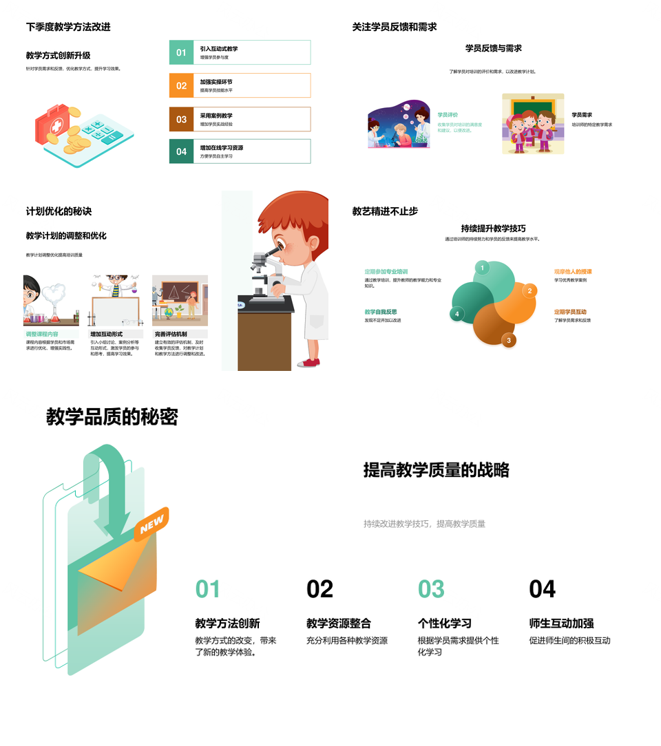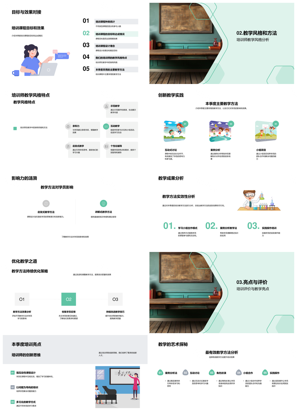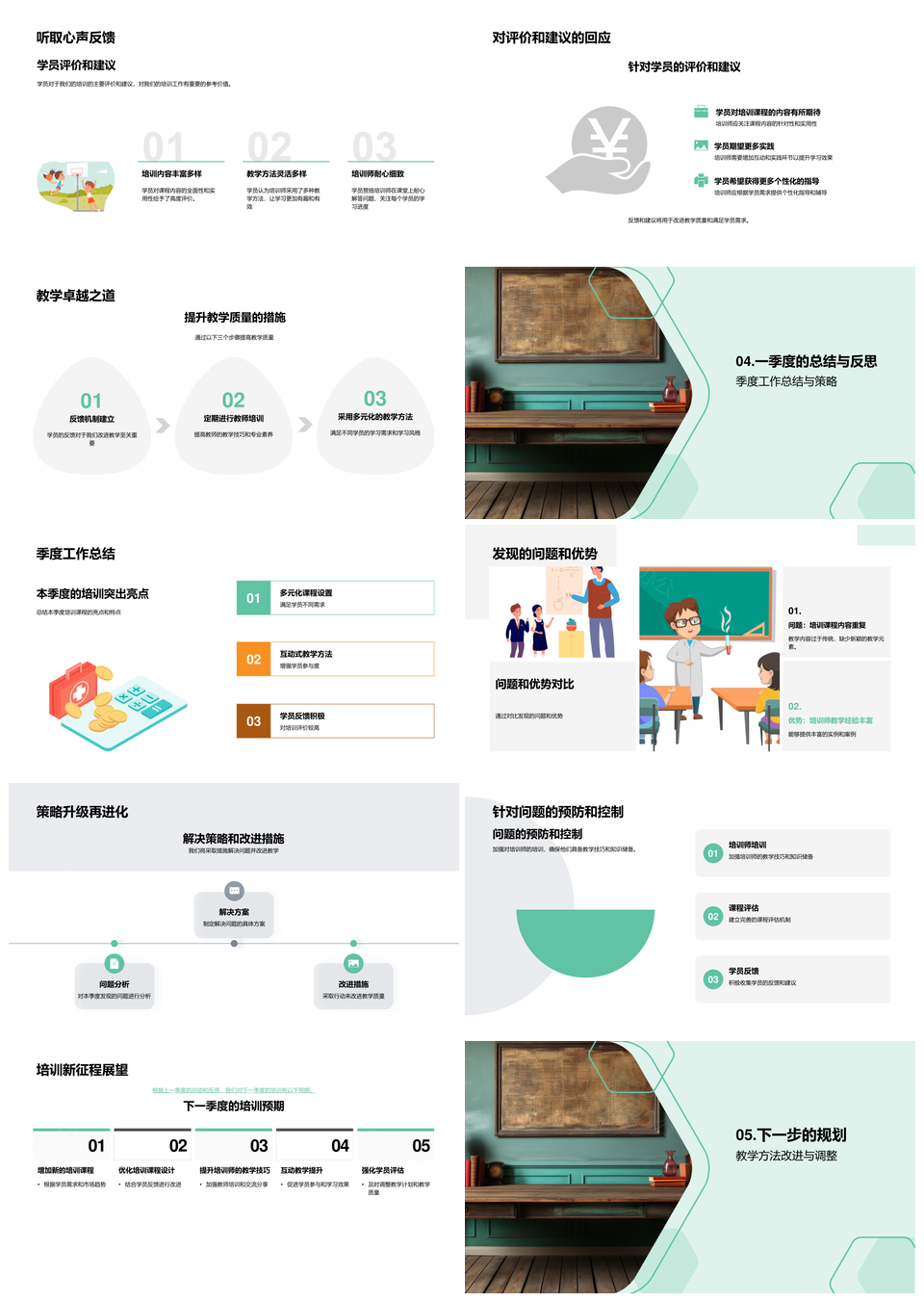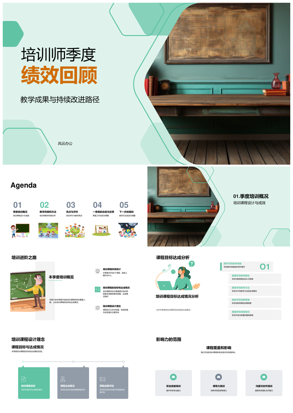 风云办公提供的培训师季度绩效教学成果改进路径回顾PPT模板,下载格式为pptx,一共33页,作品中文字及图均可以修改和编辑,图片更改请在作品中右键图片并更换,文字修改请直接点击文字进行修改。