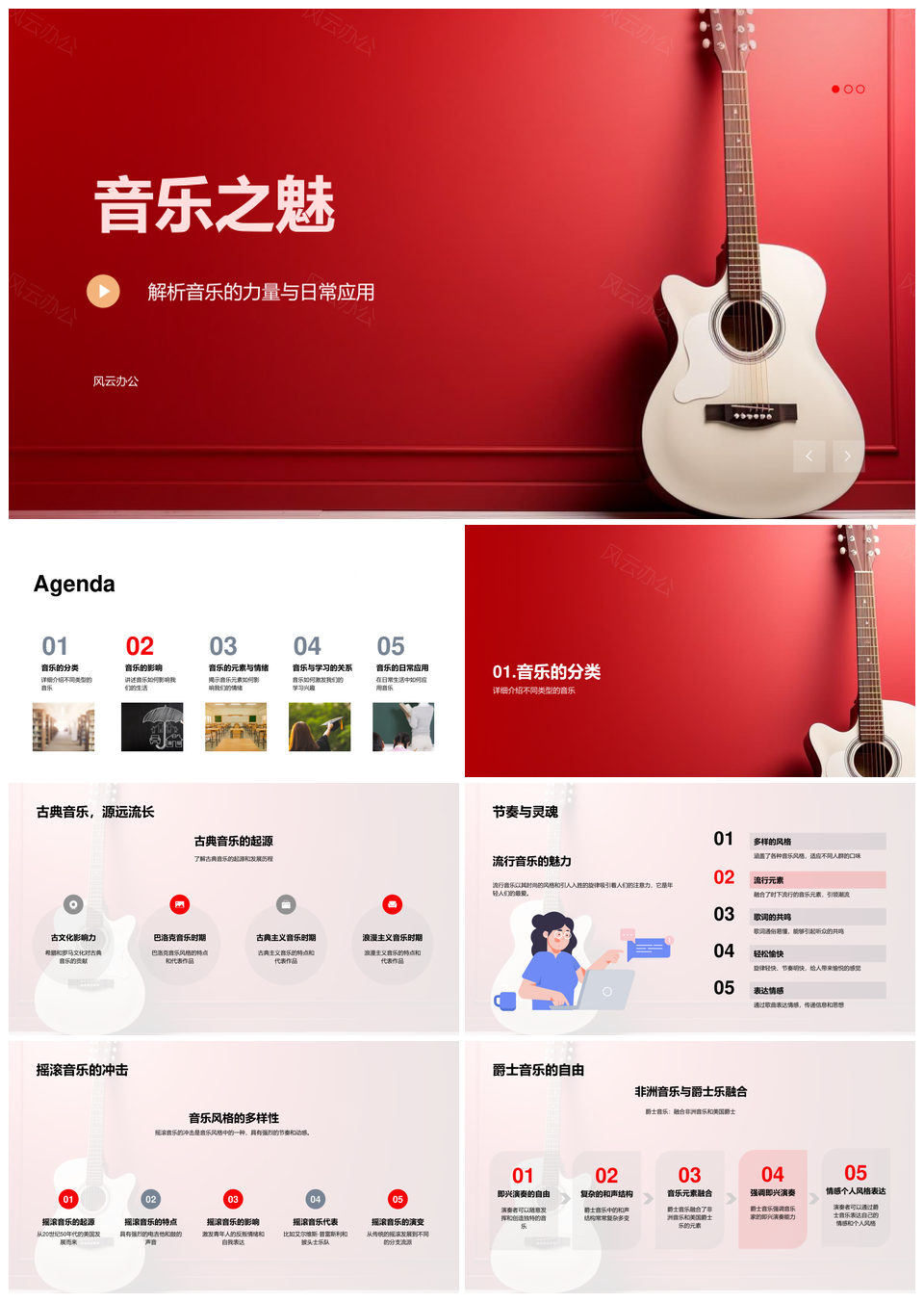 风云办公提供的音乐魅力多元力量影响日常应用PPT模板,下载格式为pptx,一共24页,作品中文字及图均可以修改和编辑,图片更改请在作品中右键图片并更换,文字修改请直接点击文字进行修改。