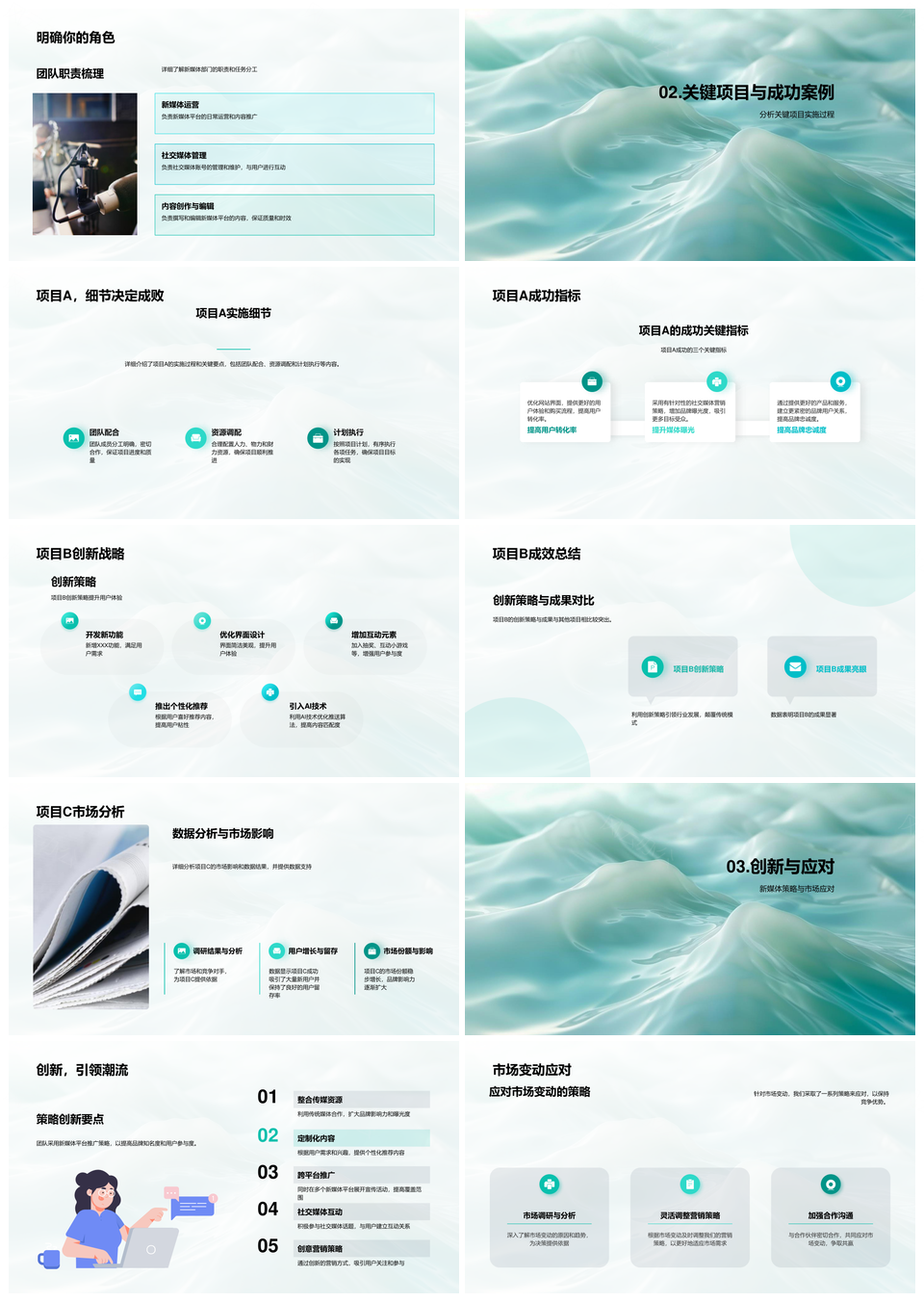 这是一张新媒体年度回顾亮点展望趋势项目ABCPPT模板,包含新媒体、年度回顾、亮点、展望、趋势、项目ABC等主题内容,也可用作新媒体年度回顾亮点展望、新媒体亮点展望趋势项目ABC、年度回顾亮点展望趋势、回顾亮点展望趋势项目ABC、新媒体年度亮点展望趋势、新媒体年度回顾亮点、年度回顾亮点展望、亮点展望趋势项目ABC、新媒体年度展望趋势、新媒体趋势项目ABC、新媒体年度回顾、新媒体亮点展望、亮点展望趋势、展望趋势项目ABC、趋势项目ABC等PPT场景使用。 风云办公提供的新媒体年度回顾亮点展望趋势项目ABCPPT模板,下载格式为pptx,一共33页,作品中文字及图均可以修改和编辑,图片更改请在作品中右键图片并更换,文字修改请直接点击文字进行修改。