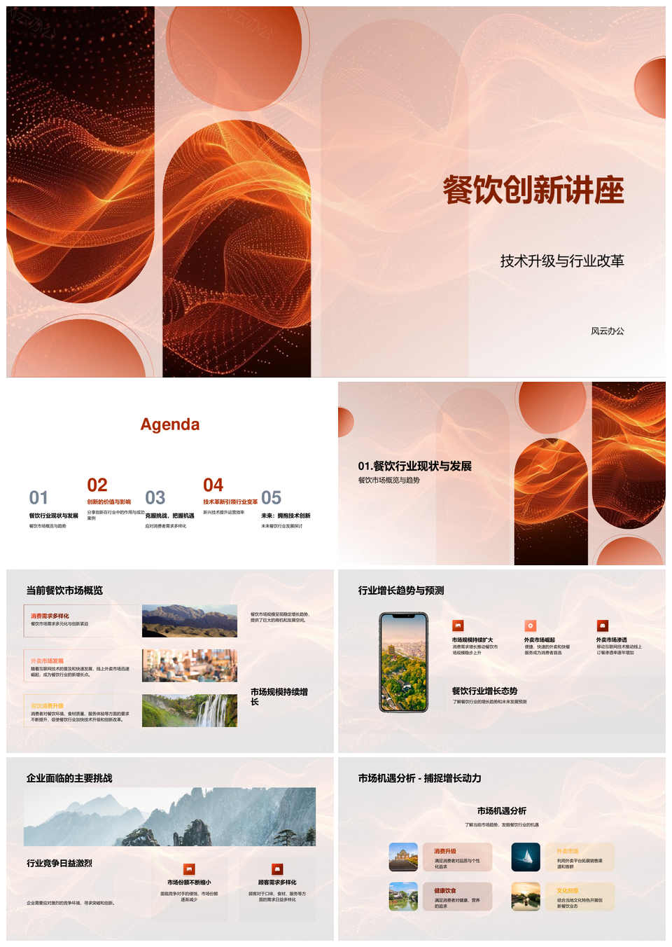 风云办公提供的餐饮创新技术升级行业改革趋势分析PPT模板,下载格式为pptx,一共28页,作品中文字及图均可以修改和编辑,图片更改请在作品中右键图片并更换,文字修改请直接点击文字进行修改。