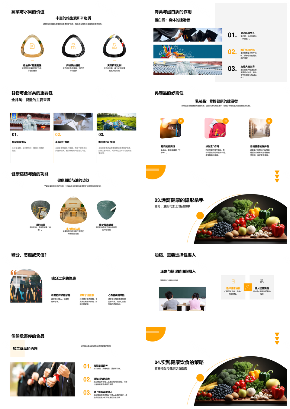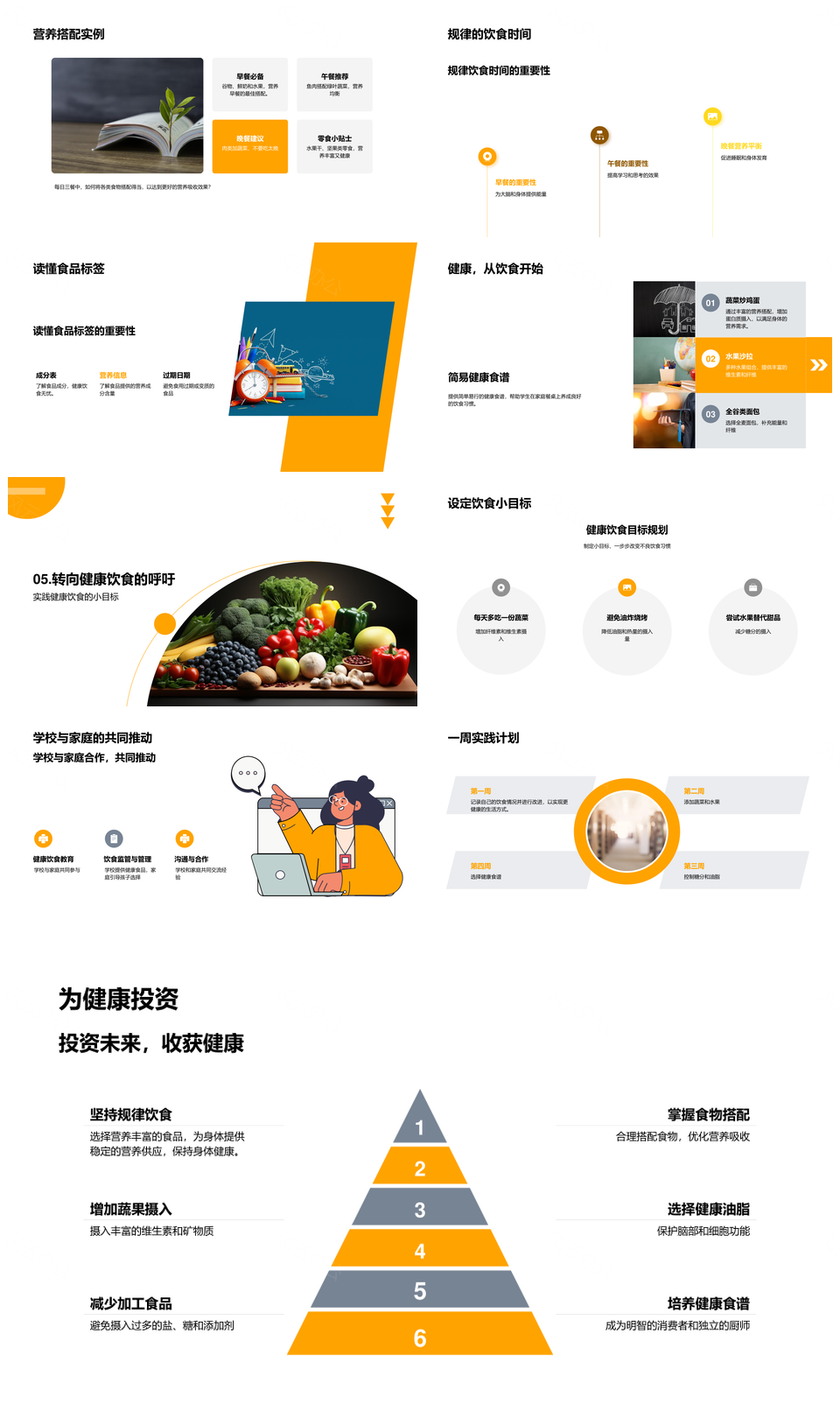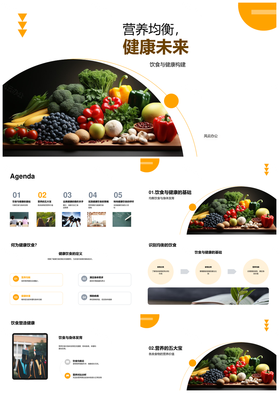 这是一张营养均衡膳食果蔬蛋白谷物共建健康未来PPT模板,包含营养均衡、膳食、果蔬、蛋白、谷物、健康未来等主题内容,也可用作营养均衡膳食果蔬、均衡膳食果蔬蛋白、膳食果蔬蛋白谷物、营养均衡膳食、均衡膳食果蔬、膳食果蔬蛋白、果蔬蛋白谷物、共建健康未来、营养均衡、均衡膳食、膳食果蔬、果蔬蛋白、蛋白谷物、谷物共建、健康未来等PPT场景使用。 风云办公提供的营养均衡膳食果蔬蛋白谷物共建健康未来PPT模板,下载格式为pptx,一共27页,作品中文字及图均可以修改和编辑,图片更改请在作品中右键图片并更换,文字修改请直接点击文字进行修改。