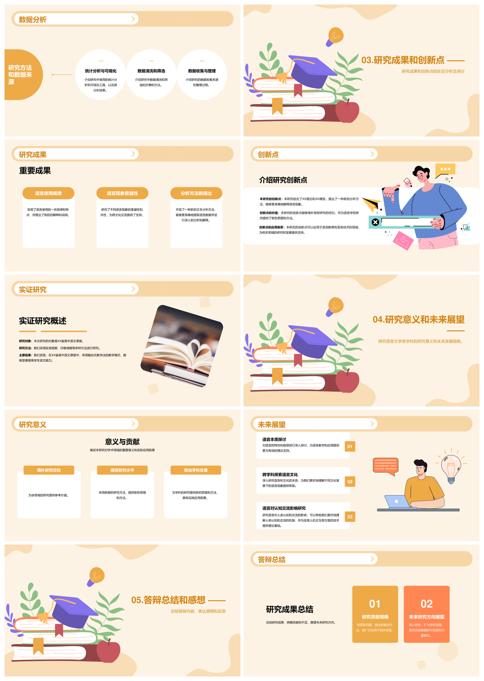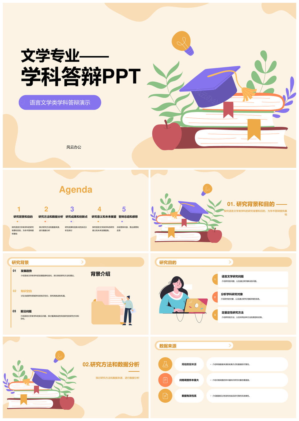 风云办公提供的黄紫插画文学书本学士帽灯泡毕业答辩PPT模板,下载格式为pptx,一共19页,作品中文字及图均可以修改和编辑,图片更改请在作品中右键图片并更换,文字修改请直接点击文字进行修改。