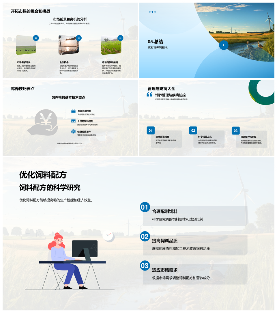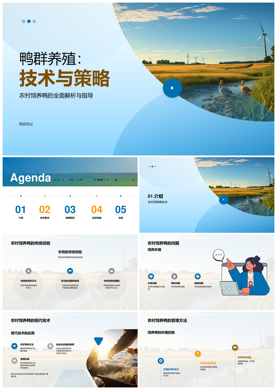 这是一张农村养鸭技术培训与养殖管理PPT模板,包含养鸭技术、培训、养殖管理等主题内容,也可用作农村养鸭技术培训、养鸭技术培训养殖、技术培训养殖管理、农村养鸭技术、养鸭技术培训、技术培训养殖、培训养殖管理、农村养鸭、养鸭技术、技术培训、培训养殖、养殖管理、农村技术培训、农村养殖管理、养鸭养殖管理等PPT场景使用。 风云办公提供的农村养鸭技术培训与养殖管理PPT模板,下载格式为pptx,一共23页,作品中文字及图均可以修改和编辑,图片更改请在作品中右键图片并更换,文字修改请直接点击文字进行修改。