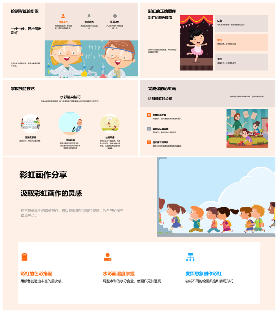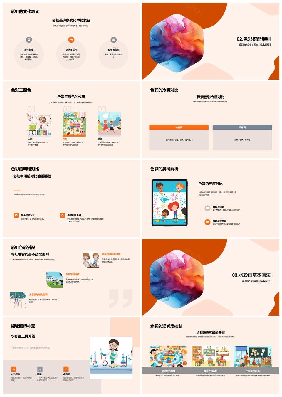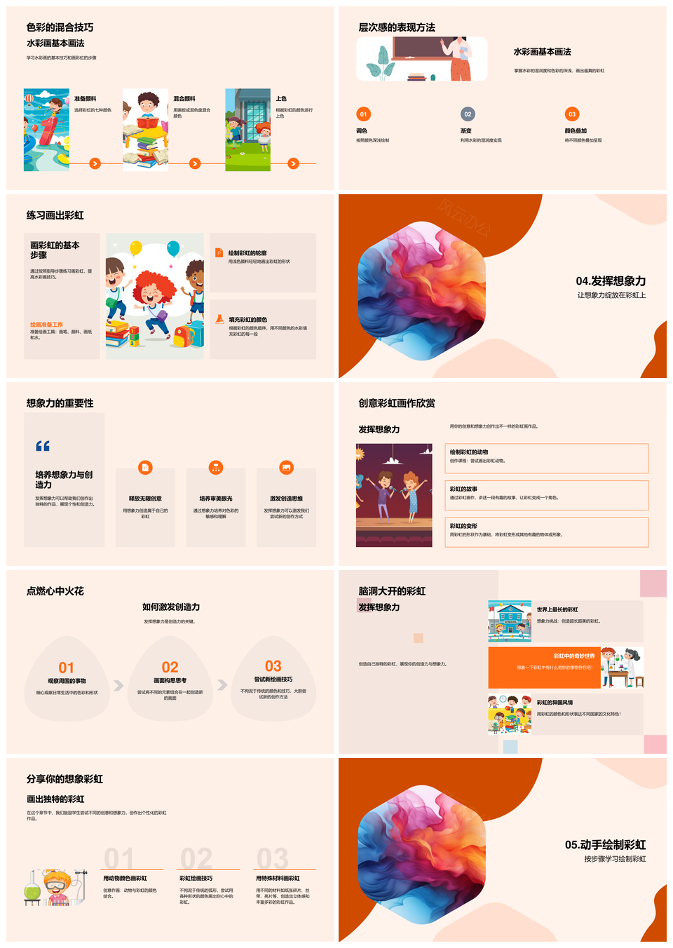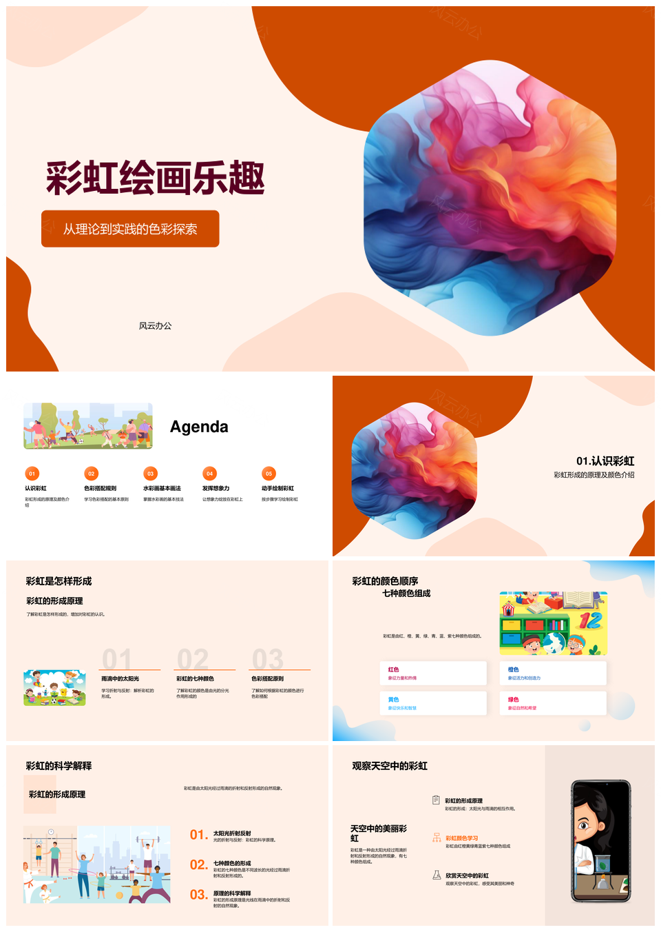 风云办公提供的彩虹水彩绘画色彩混合搭配技巧探索PPT模板,下载格式为pptx,一共33页,作品中文字及图均可以修改和编辑,图片更改请在作品中右键图片并更换,文字修改请直接点击文字进行修改。