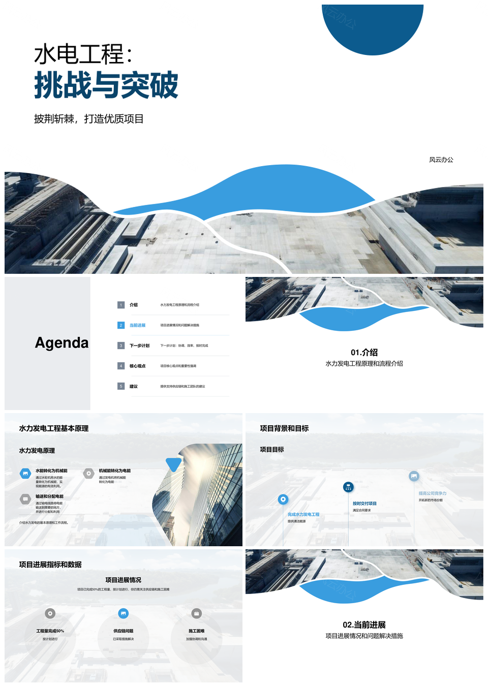 风云办公提供的水电站施工项目进展与管理技术突破PPT模板,下载格式为pptx,一共25页,作品中文字及图均可以修改和编辑,图片更改请在作品中右键图片并更换,文字修改请直接点击文字进行修改。