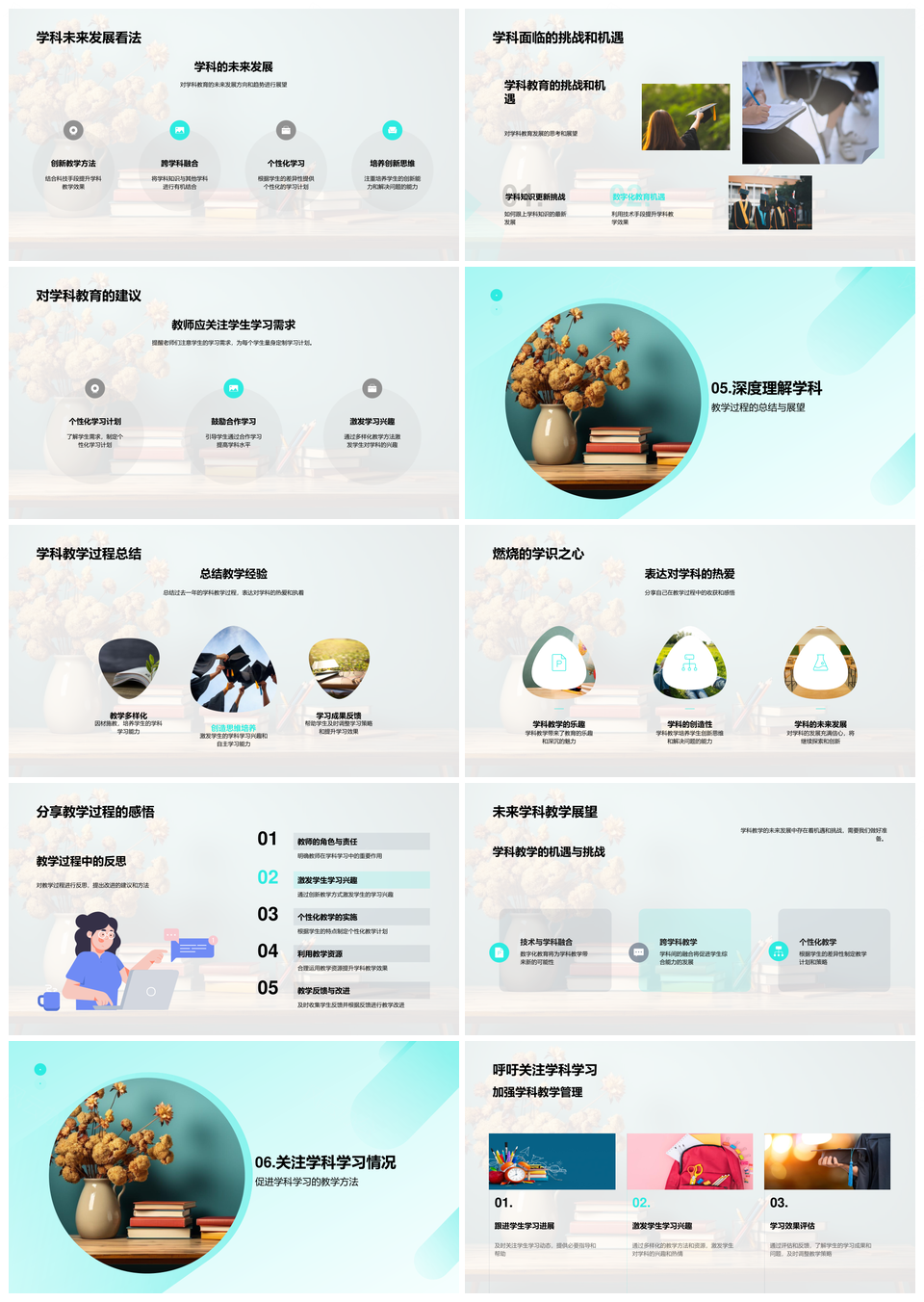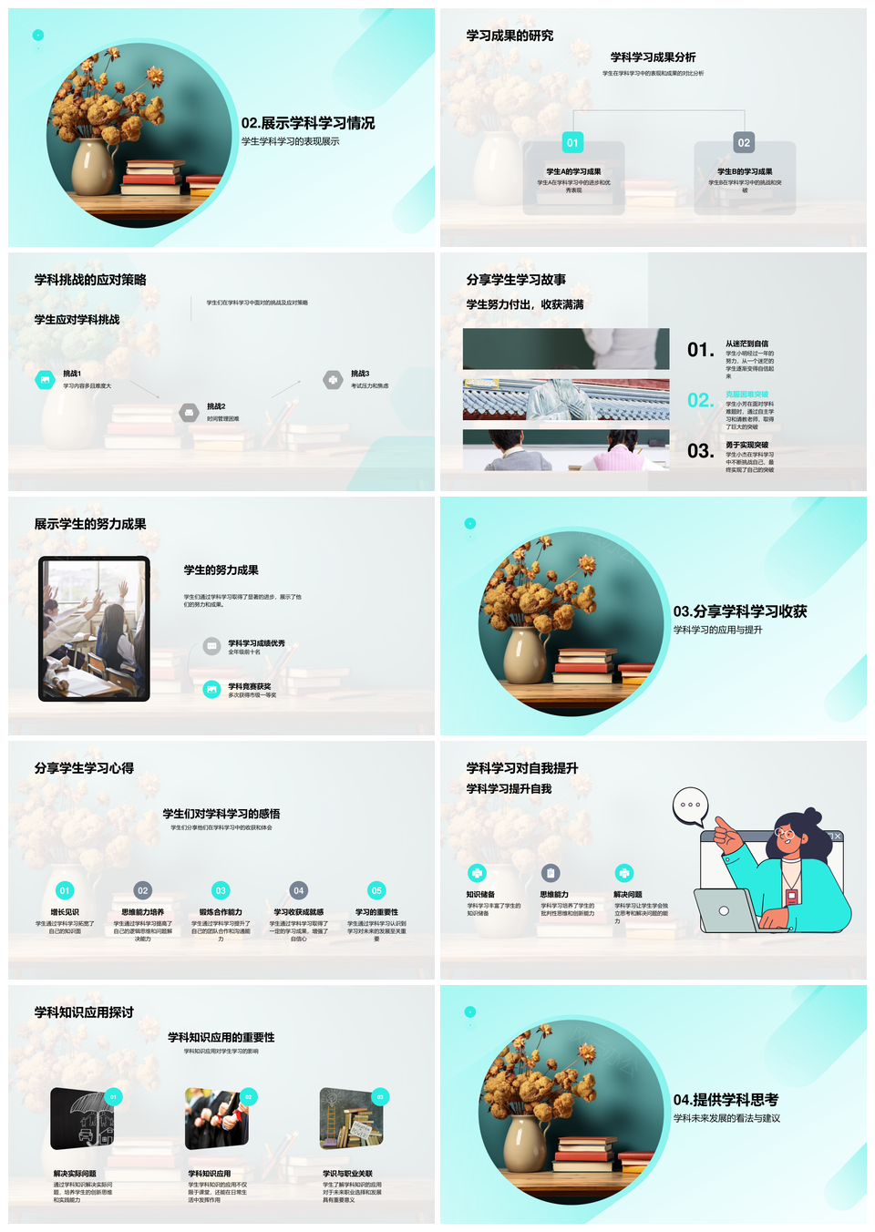这套模板专为初三年级学科总结设计,以学术观察为核心,融入自然与科学元素,适配教研汇报、读书会等场景。封面采用书本堆叠的立体构图,搭配几何线条勾勒的花瓶与抽象花朵插画,营造理性与人文交融的视觉基调。内页设有波粒二象性动态模型图、激光实验数据图表等专属模块,逻辑层级分明,支持文献引用标注。全模板采用低饱和蓝灰主色调,搭配暗金线条点缀,既保留教育场景的严谨感,又通过模块化布局提升内容延展性,适合深度解析科学原理与教学成果展示。