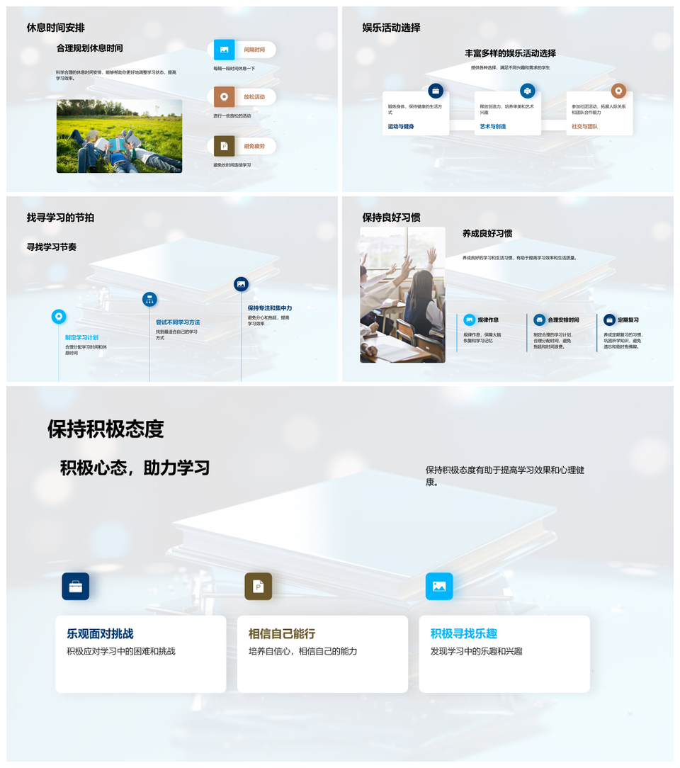 这是一张高一学业生活平衡时间管理书海高效减压课外兴趣经验PPT模板,包含学业、生活、平衡、时间管理、书海、高效、减压、课外兴趣、经验等主题内容,也可用作高一学业生活平衡、学业生活平衡时间管理、生活平衡时间管理书海、平衡时间管理高效减压、时间管理高效减压课外、管理高效减压课外兴趣、高效减压课外兴趣经验、课外兴趣经验高一学业、经验高一学业生活平衡、高一学业时间管理、学业生活高效减压、生活平衡课外兴趣、时间管理书海高效、高效减压课外经验、课外兴趣平衡时间等PPT场景使用。 风云办公提供的高一学业生活平衡时间管理书海高效减压课外兴趣经验PPT模板,下载格式为pptx,一共33页,作品中文字及图均可以修改和编辑,图片更改请在作品中右键图片并更换,文字修改请直接点击文字进行修改。