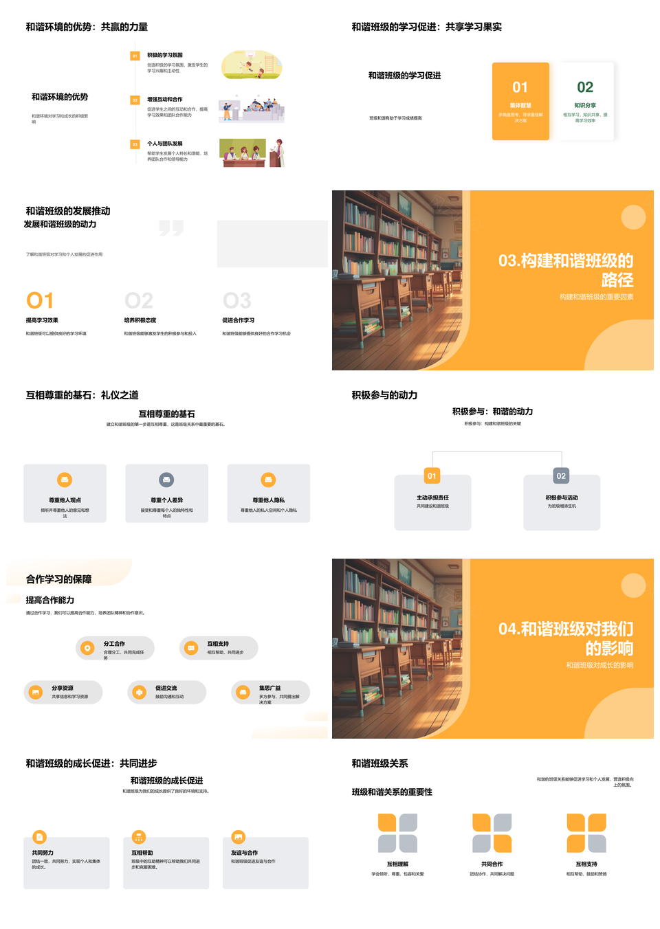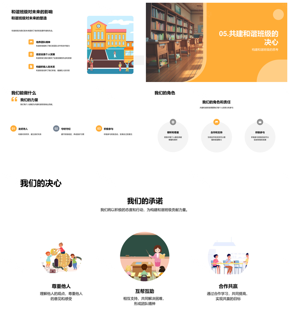 风云办公提供的共建和谐班级合作互敬共进共赢环境PPT模板,下载格式为pptx,一共23页,作品中文字及图均可以修改和编辑,图片更改请在作品中右键图片并更换,文字修改请直接点击文字进行修改。