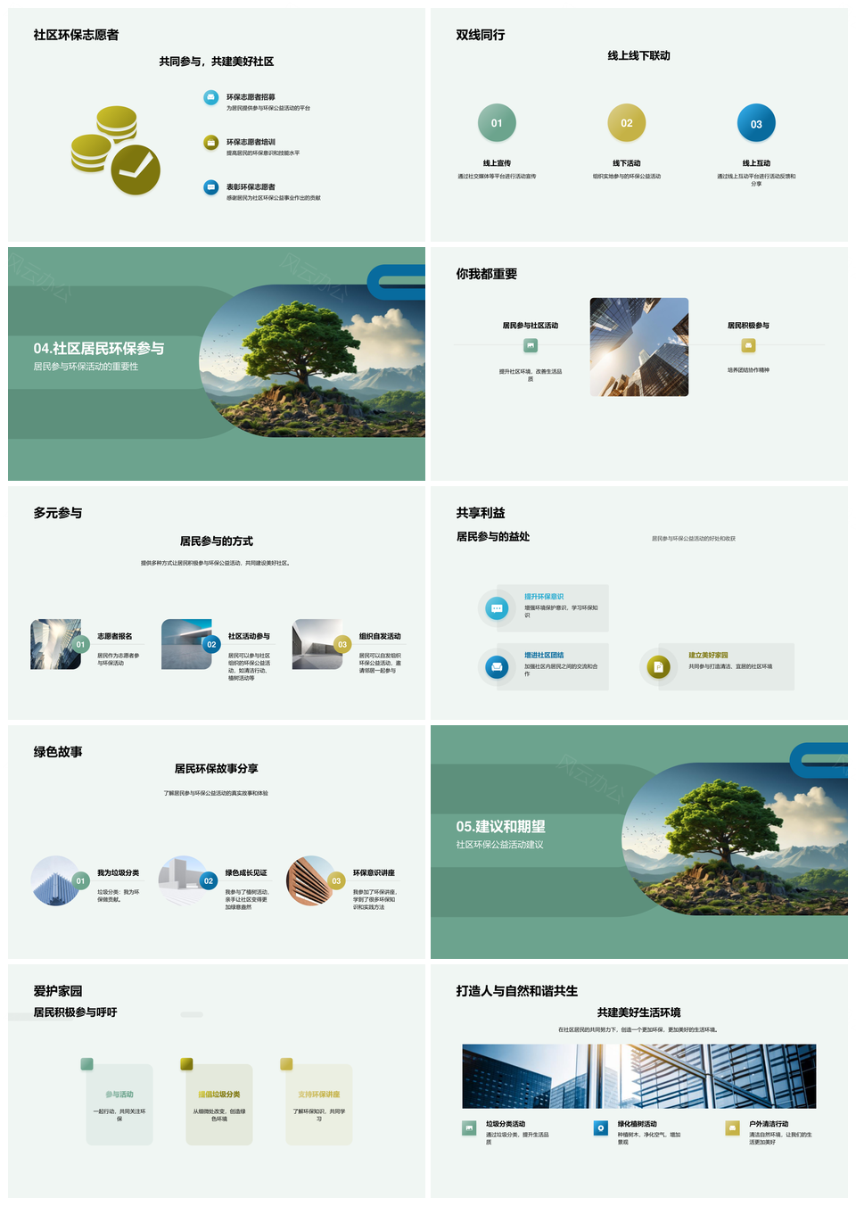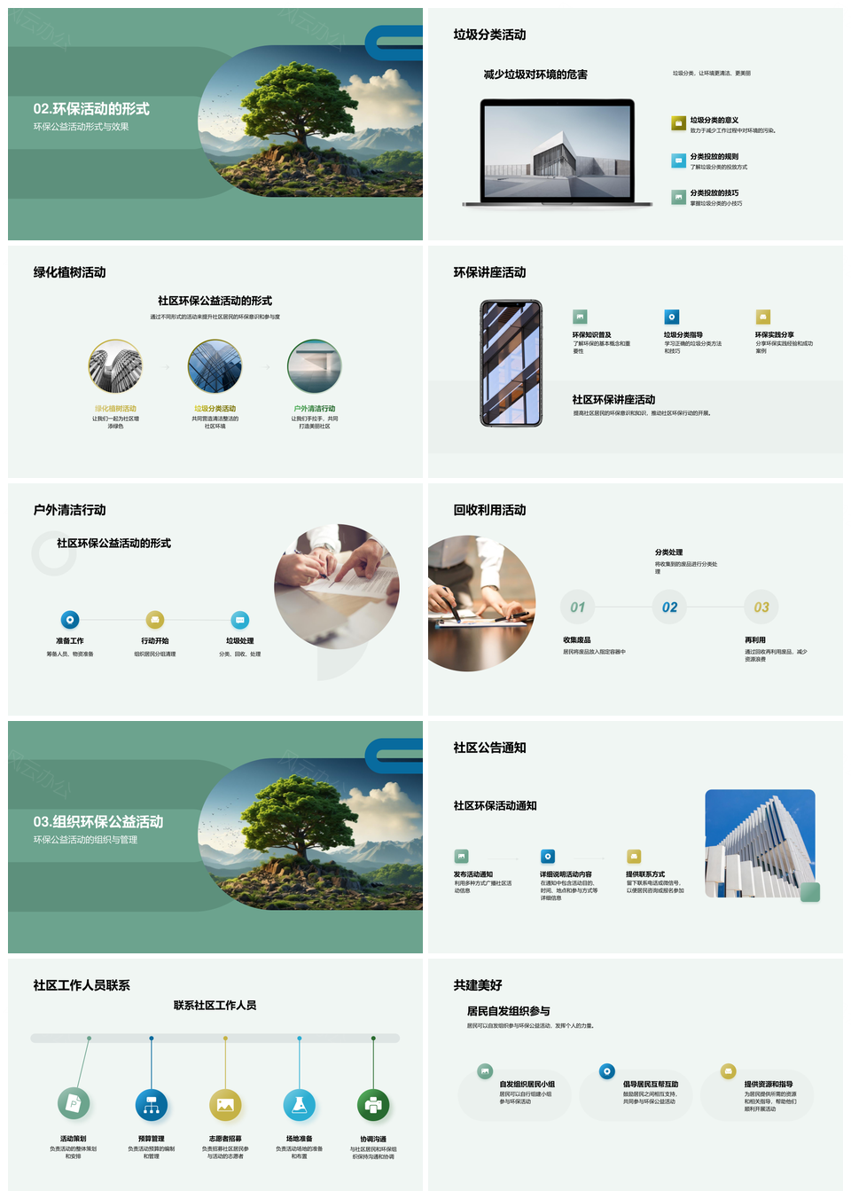 这是一张居民携手护绿垃圾分类植树清洁共建环保社区PPT模板,包含居民、携手、护绿、垃圾分类、植树、清洁、共建、环保社区等主题内容,也可用作居民携手护绿垃圾分类、护绿垃圾分类植树清洁、垃圾分类植树清洁共建、植树清洁共建环保社区、居民携手护绿、护绿垃圾分类植树、垃圾分类植树清洁、植树清洁共建、清洁共建环保、共建环保社区、居民携手、护绿垃圾分类、垃圾分类植树、植树清洁、清洁共建等PPT场景使用。 风云办公提供的居民携手护绿垃圾分类植树清洁共建环保社区PPT模板,下载格式为pptx,一共30页,作品中文字及图均可以修改和编辑,图片更改请在作品中右键图片并更换,文字修改请直接点击文字进行修改。