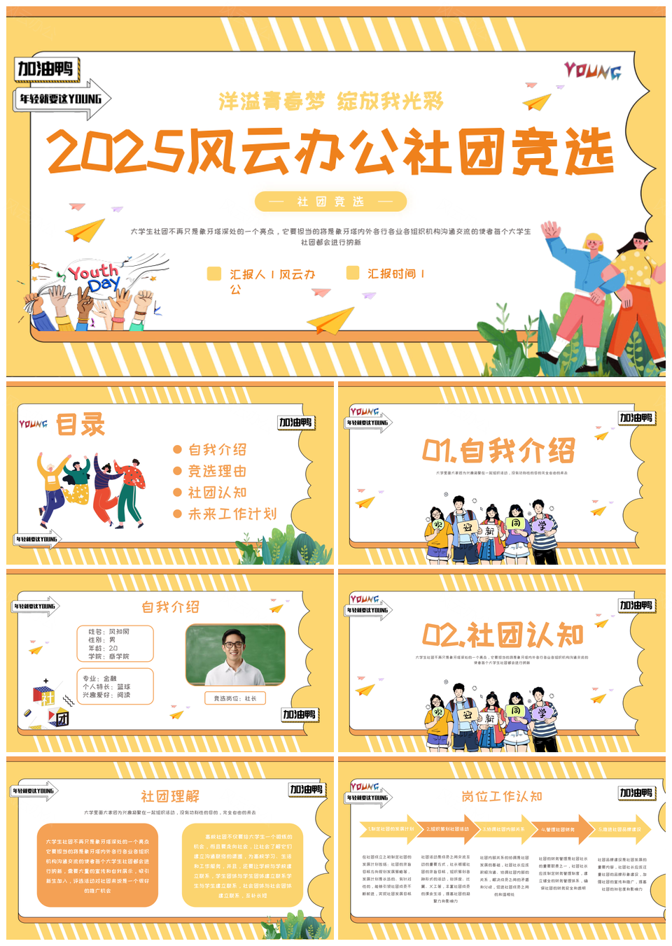 这是一张2025黄色插画社团学生会竞选部长自我介绍PPT模板,包含2025、黄色、插画、社团、学生会、竞选、部长、自我介绍等主题内容,也可用作2025、黄色、插画、社团、学生会、竞选、部长、自我介绍 2025黄色插画社团、黄色插画社团学生会、社团学生会竞选部长、学生会竞选部长自我介绍、黄色插画社团、插画社团学生会、社团学生会竞选、学生会竞选部长、竞选部长自我介绍、黄色插画、插画社团、社团学生会、学生会竞选、竞选部长、部长自我介绍等PPT场景使用。 风云办公提供的2025黄色插画社团学生会竞选部长自我介绍PPT模板,下载格式为pptx,一共16页,作品中文字及图均可以修改和编辑,图片更改请在作品中右键图片并更换,文字修改请直接点击文字进行修改。