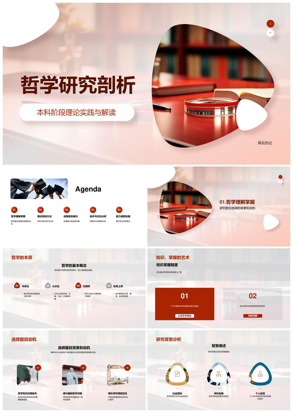 风云办公提供的哲学本科研究选题答辩指导与理论方法PPT模板,下载格式为pptx,一共33页,作品中文字及图均可以修改和编辑,图片更改请在作品中右键图片并更换,文字修改请直接点击文字进行修改。