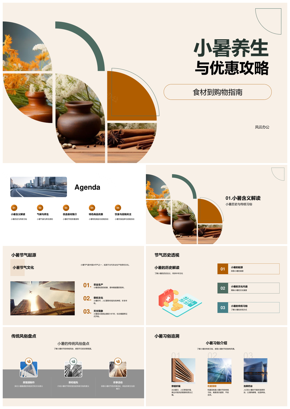 风云办公提供的小暑养生饮食购物优惠攻略PPT模板,下载格式为pptx,一共33页,作品中文字及图均可以修改和编辑,图片更改请在作品中右键图片并更换,文字修改请直接点击文字进行修改。