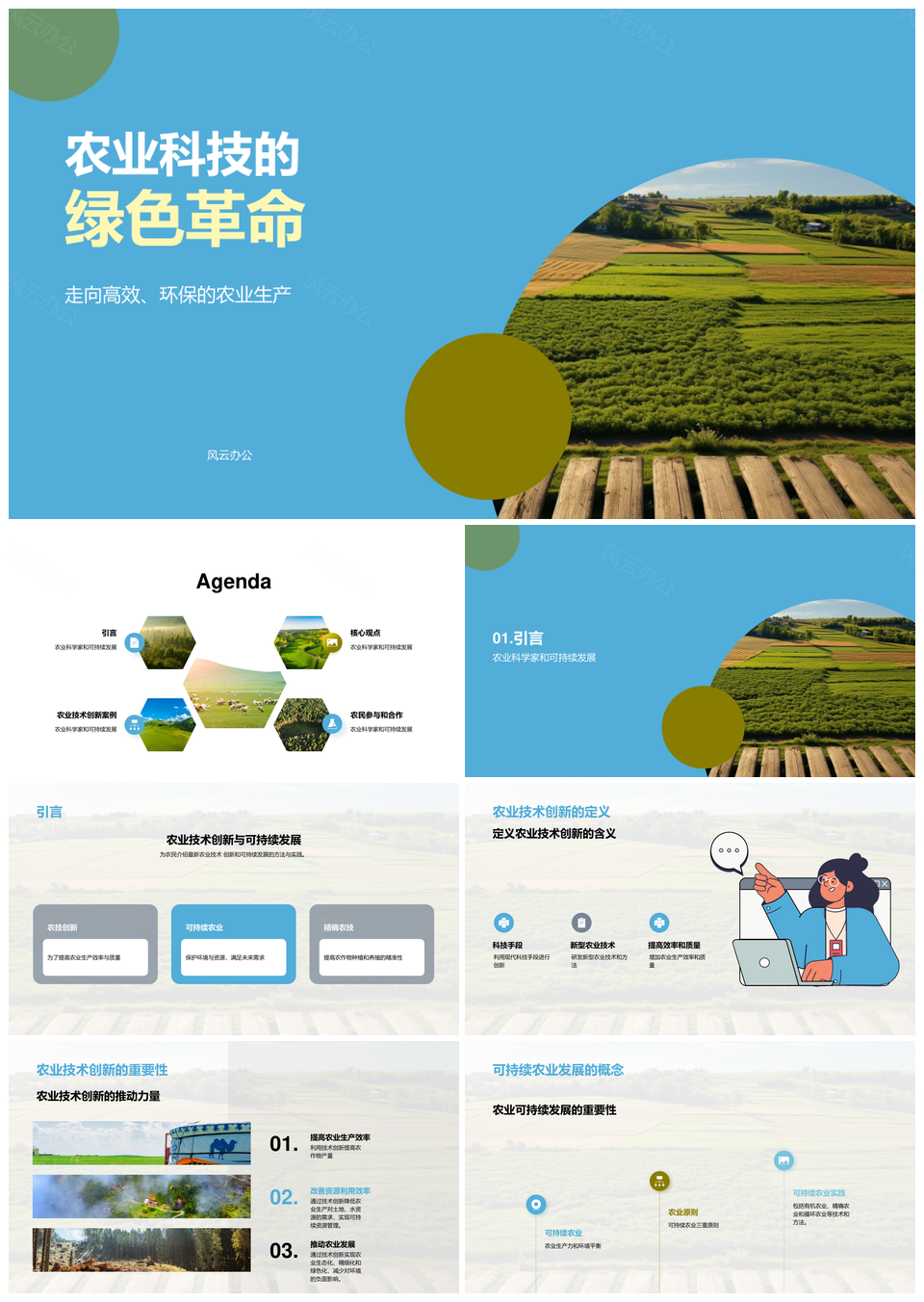 风云办公提供的农业科技创新驱动绿色可持续发展PPT模板,下载格式为pptx,一共24页,作品中文字及图均可以修改和编辑,图片更改请在作品中右键图片并更换,文字修改请直接点击文字进行修改。