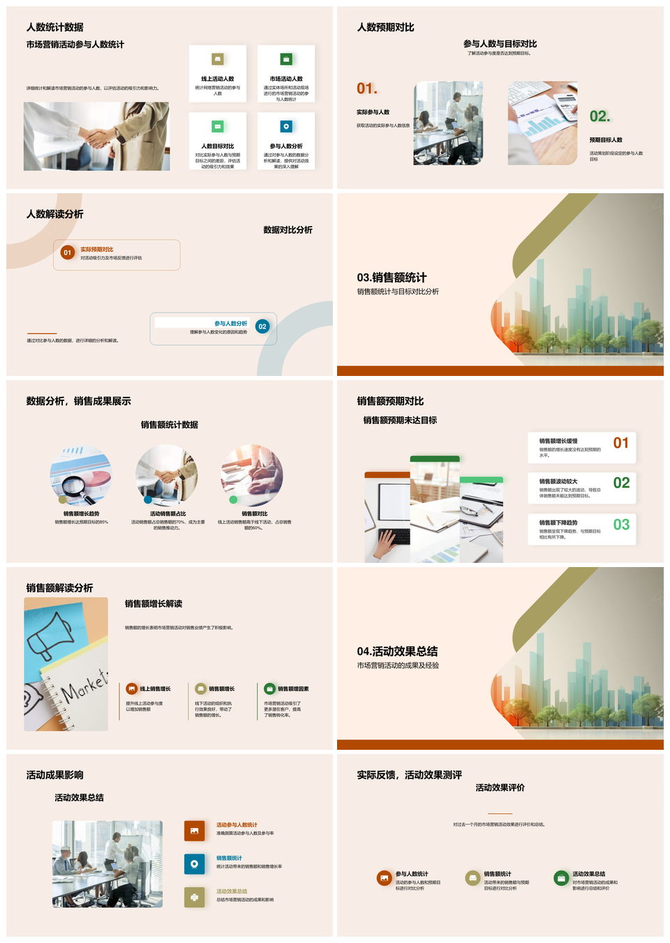 这是一张营销活动绩效统计参与人数销售额策略分析PPT模板,包含营销活动、绩效统计、参与人数、销售额、策略分析等主题内容,也可用作营销活动绩效统计参与人数销售额策略分析、绩效统计参与人数销售额策略分析、营销活动绩效统计参与人数、绩效统计参与人数销售额、参与人数销售额策略分析、营销活动绩效统计、绩效统计参与人数、参与人数销售额、销售额策略分析、营销活动绩效统计策略分析、营销活动参与人数销售额、营销活动销售额策略分析、绩效统计销售额策略分析、营销活动策略分析、参与人数策略分析等PPT场景使用。 风云办公提供的营销活动绩效统计参与人数销售额策略分析PPT模板,下载格式为pptx,一共23页,作品中文字及图均可以修改和编辑,图片更改请在作品中右键图片并更换,文字修改请直接点击文字进行修改。