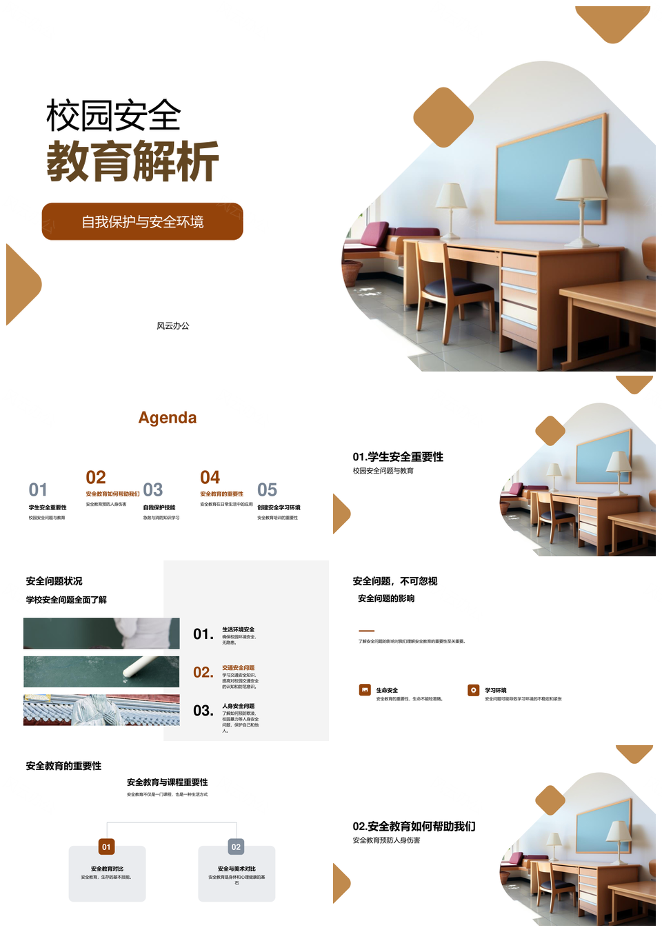 风云办公提供的校园安全教育防护自救急救消防知识PPT模板,下载格式为pptx,一共23页,作品中文字及图均可以修改和编辑,图片更改请在作品中右键图片并更换,文字修改请直接点击文字进行修改。