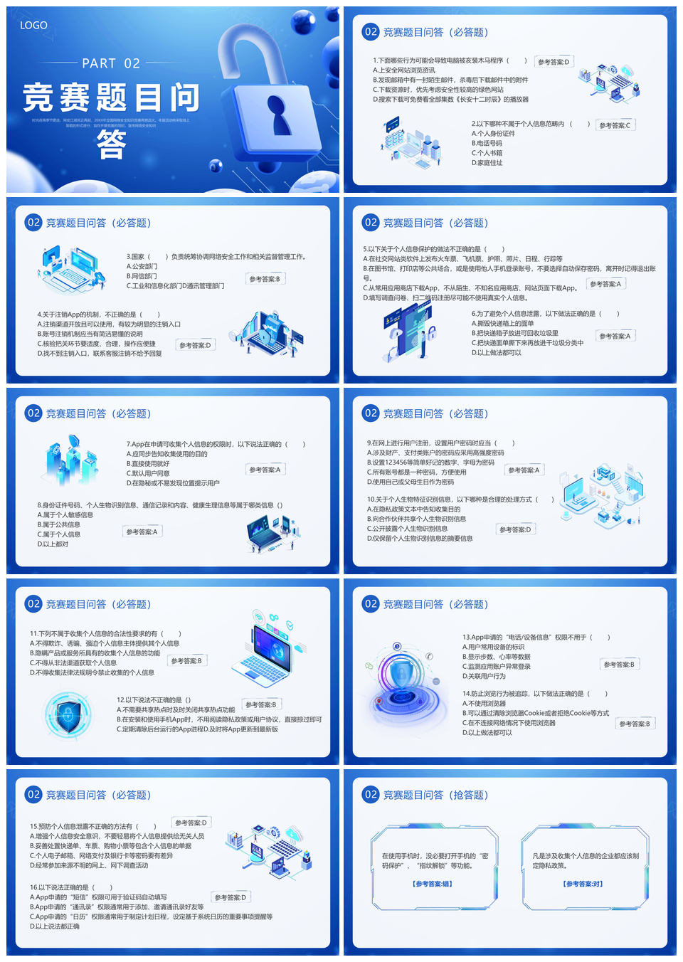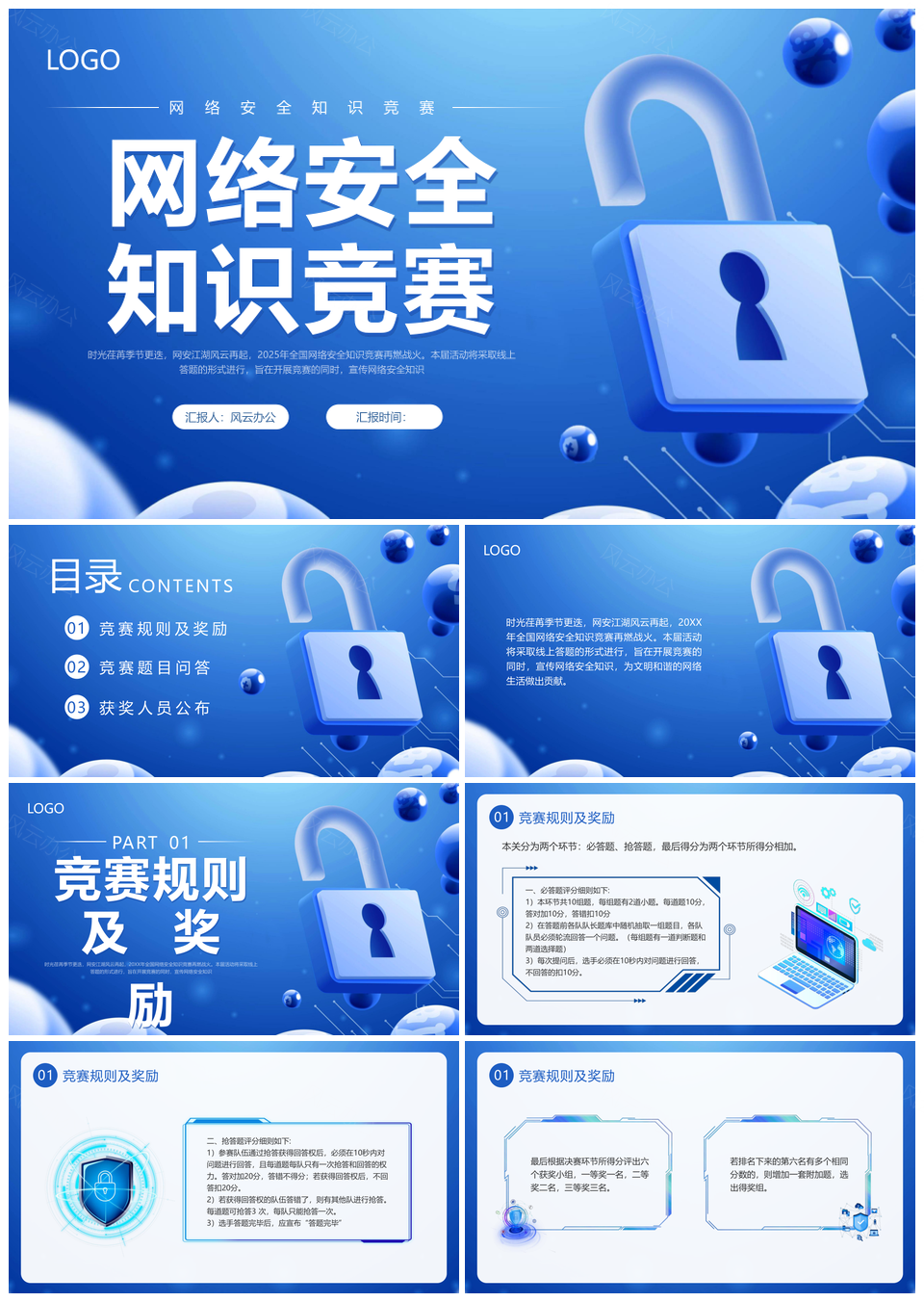 这是一张2025国家网络安全周蓝色卡通知识竞赛宣传PPT模板,包含2025、国家、网络安全周、蓝色、卡通、知识竞赛、宣传等主题内容,也可用作2025国家网络安全蓝色卡通、蓝色卡通知识竞赛宣传、2025国家网络安全、国家网络安全蓝色卡通、网络安全蓝色卡通知识竞赛、蓝色卡通知识竞赛、知识竞赛宣传、2025国家、国家网络安全、蓝色卡通、卡通知识竞赛、知识竞赛宣传、网络安全知识竞赛、网络安全宣传、国家网络安全知识竞赛等PPT场景使用。 风云办公提供的2025国家网络安全周蓝色卡通知识竞赛宣传PPT模板,下载格式为pptx,一共24页,作品中文字及图均可以修改和编辑,图片更改请在作品中右键图片并更换,文字修改请直接点击文字进行修改。
