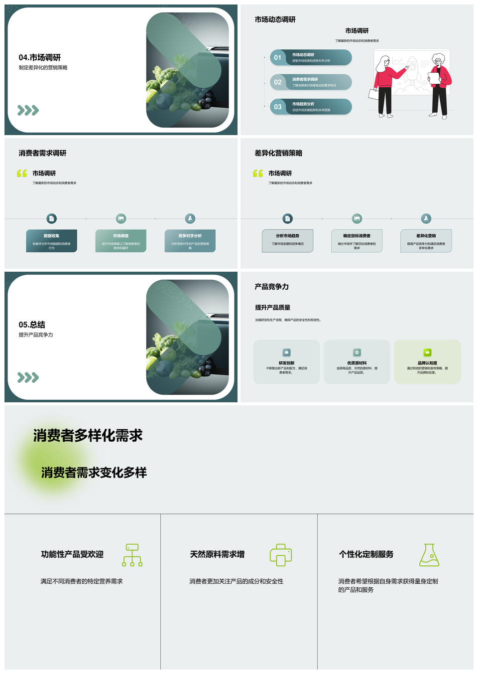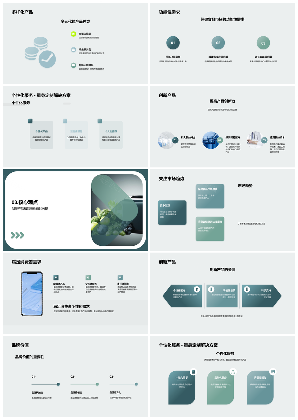这是一张保健食品市场趋势多样化功能个性化需求PPT模板,包含保健食品、市场、趋势、多样化、功能、个性化、需求等主题内容,也可用作保健食品市场趋势多样化、市场趋势多样化功能、趋势多样化功能个性化、多样化功能个性化需求、保健食品市场趋势、市场趋势多样化、趋势多样化功能、多样化功能个性化、功能个性化需求、保健食品市场、市场趋势、趋势多样化、多样化功能、功能个性化、个性化需求等PPT场景使用。 风云办公提供的保健食品市场趋势多样化功能个性化需求PPT模板,下载格式为pptx,一共25页,作品中文字及图均可以修改和编辑,图片更改请在作品中右键图片并更换,文字修改请直接点击文字进行修改。