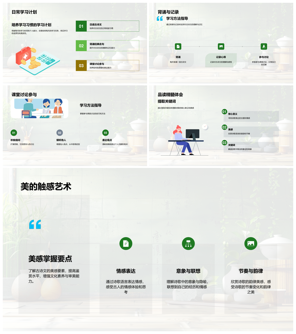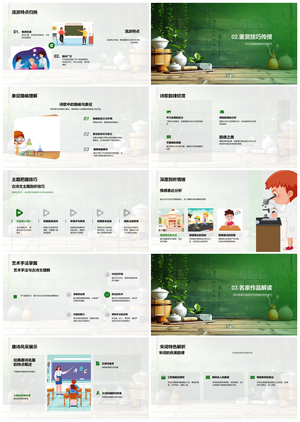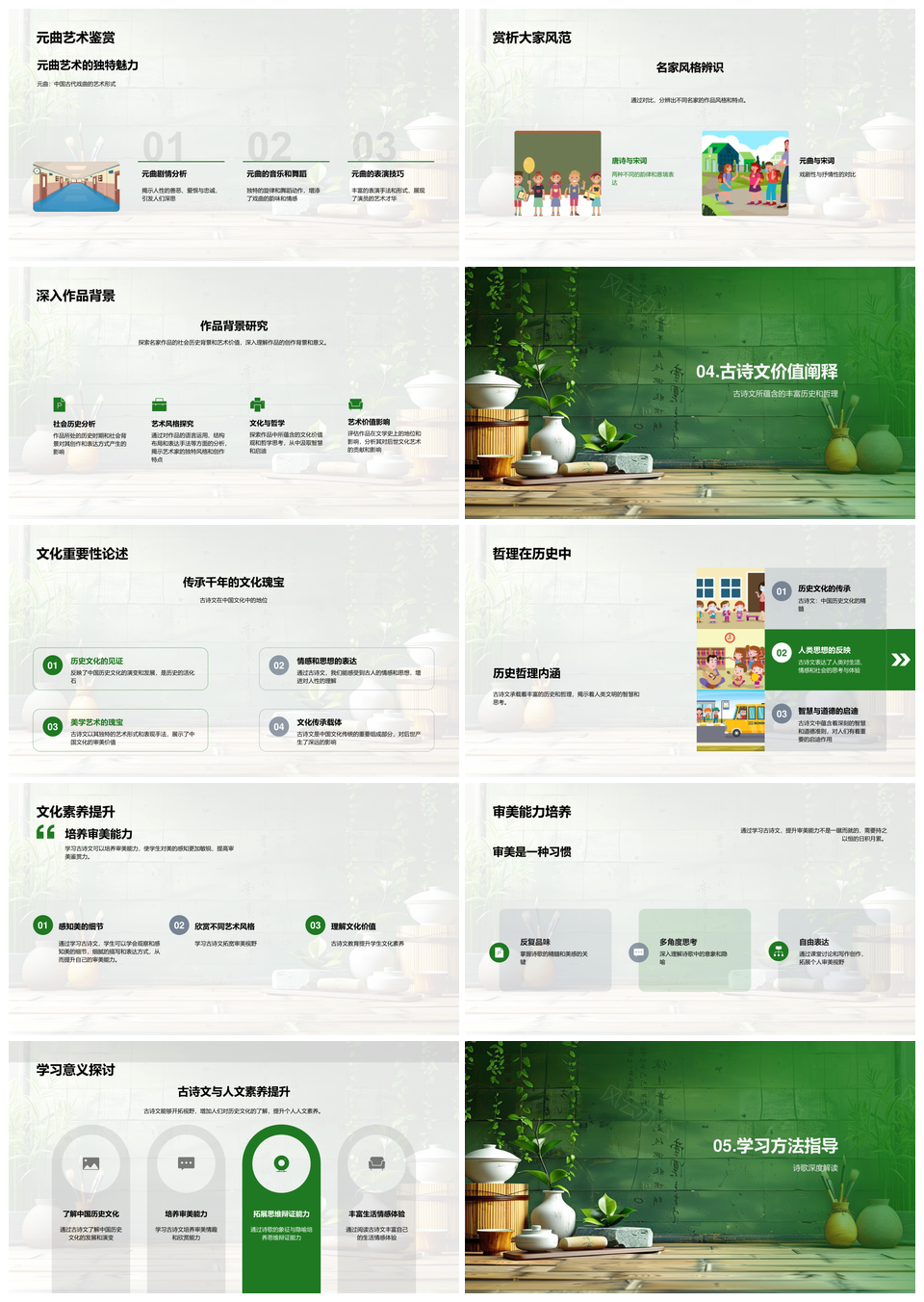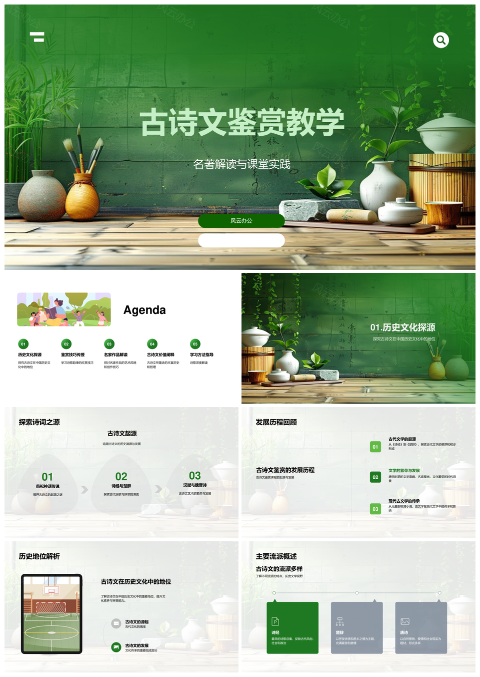 这是一张唐诗宋词元曲古诗文鉴赏艺术创作技巧教学PPT模板,包含唐诗、宋词、元曲、古诗文、鉴赏、艺术、创作、技巧、教学等主题内容,也可用作唐诗宋词元曲鉴赏、宋词元曲古诗文鉴赏、古诗文鉴赏艺术创作、艺术创作技巧教学、唐诗宋词创作技巧、元曲古诗文鉴赏、艺术创作技巧、创作技巧教学、唐诗宋词教学、宋词元曲鉴赏、艺术创作教学、唐诗宋词、元曲古诗文、鉴赏艺术、创作技巧等PPT场景使用。 风云办公提供的唐诗宋词元曲古诗文鉴赏艺术创作技巧教学PPT模板,下载格式为pptx,一共33页,作品中文字及图均可以修改和编辑,图片更改请在作品中右键图片并更换,文字修改请直接点击文字进行修改。