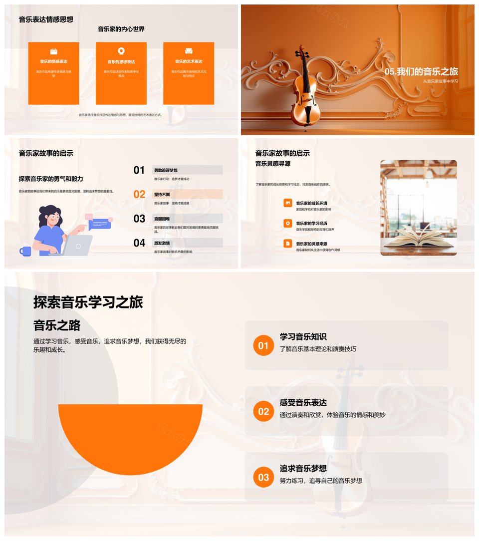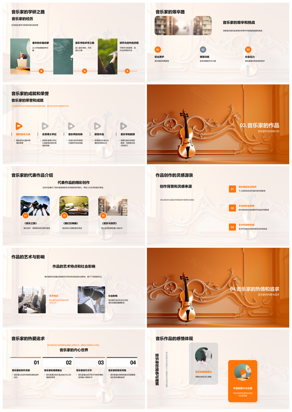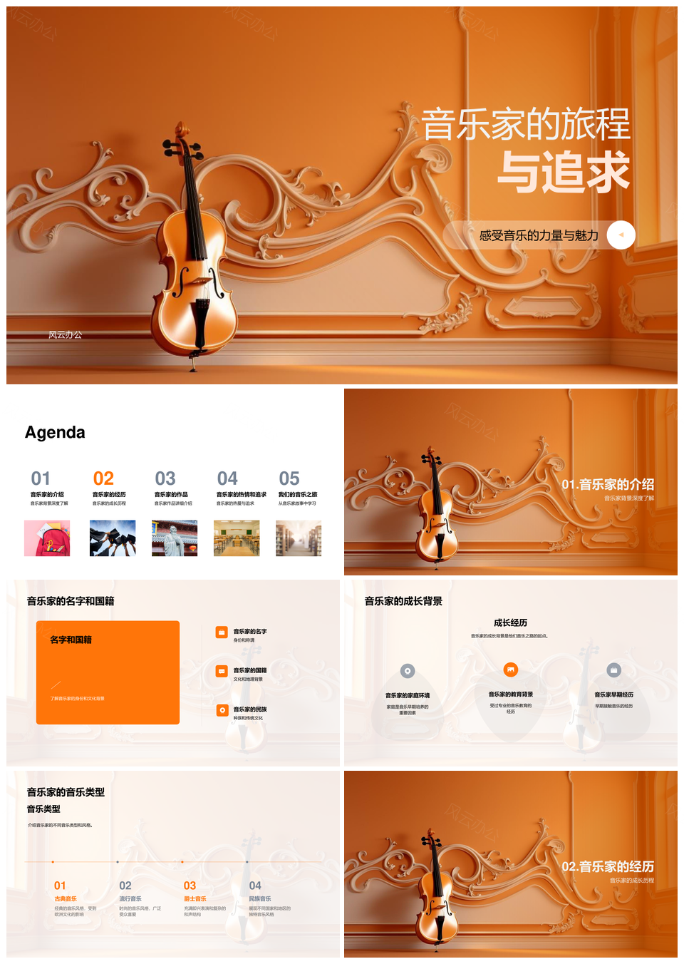 风云办公提供的音乐家多元乐型成长研习挑战荣光经典PPT模板,下载格式为pptx,一共23页,作品中文字及图均可以修改和编辑,图片更改请在作品中右键图片并更换,文字修改请直接点击文字进行修改。
