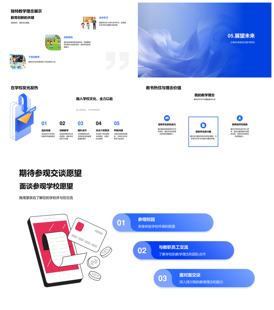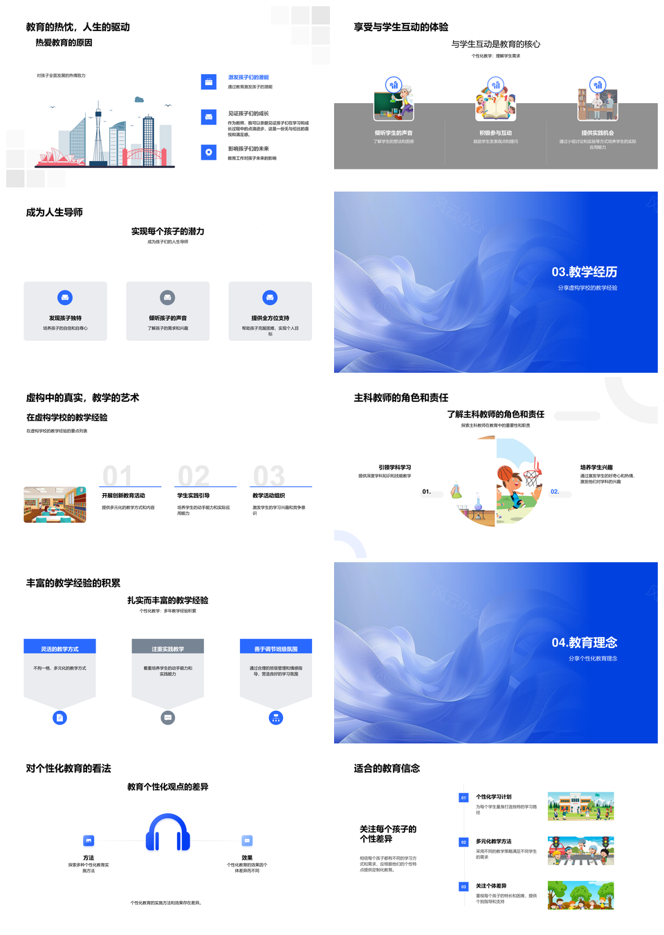 这是一张教师求职自述教育理念经验背景趋势热爱互动信念PPT模板,包含教师、求职、自述、教育理念、经验、背景、趋势、热爱、互动、信念等主题内容,也可用作教师求职自述教育理念、教师教育理念经验背景、教育理念经验背景趋势、求职自述教育理念经验、教育理念背景趋势热爱、自述教育理念经验互动、教育背景趋势互动信念、教师教育背景趋势热爱、教师热爱互动教育信念、求职教育背景趋势互动、教师自述经验互动信念、教育理念热爱互动信念、教师背景趋势互动信念、求职教育理念经验背景、教育经验背景趋势互动等PPT场景使用。 风云办公提供的教师求职自述教育理念经验背景趋势热爱互动信念PPT模板,下载格式为pptx,一共23页,作品中文字及图均可以修改和编辑,图片更改请在作品中右键图片并更换,文字修改请直接点击文字进行修改。
