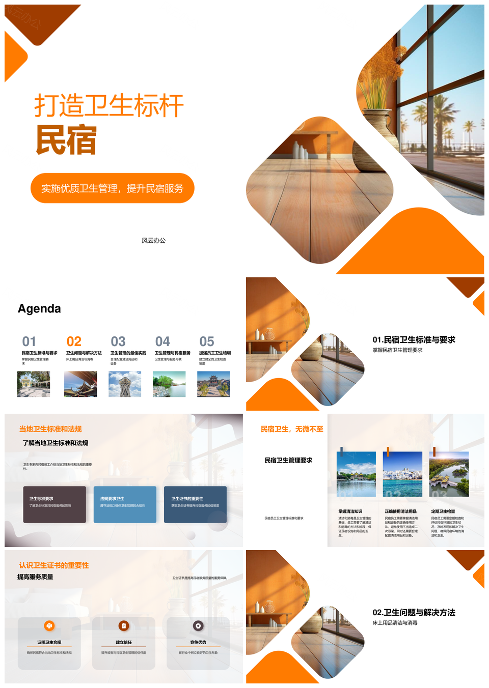 风云办公提供的民宿卫生管理专家指导对标法规创标杆PPT模板,下载格式为pptx,一共23页,作品中文字及图均可以修改和编辑,图片更改请在作品中右键图片并更换,文字修改请直接点击文字进行修改。