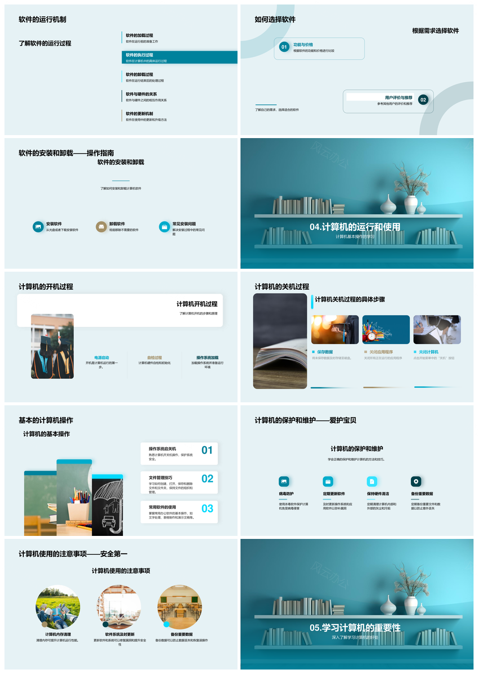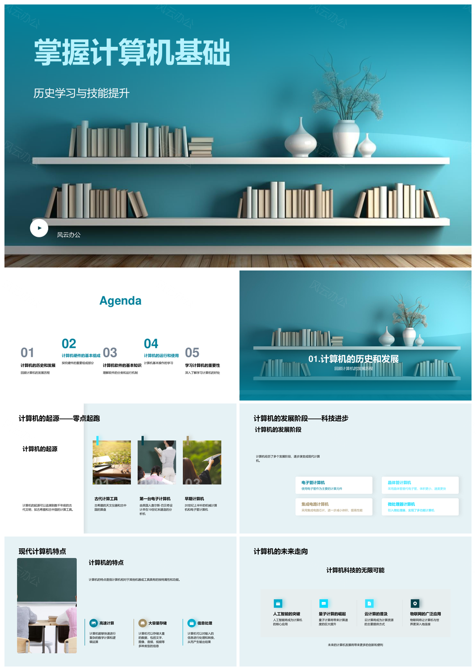 这是一张计算机基础起源发展阶段与软硬件组成解析PPT模板,包含计算机基础、起源、发展、阶段、软硬件、组成、解析等主题内容,也可用作计算机基础起源发展、基础起源发展阶段、发展阶段软硬件组成、计算机基础软硬件组成、计算机基础软硬件、基础起源发展、起源发展阶段、发展阶段软硬件、阶段软硬件组成、软硬件组成解析、计算机基础发展、计算机软硬件解析、计算机基础、发展阶段、软硬件组成等PPT场景使用。 风云办公提供的计算机基础起源发展阶段与软硬件组成解析PPT模板,下载格式为pptx,一共33页,作品中文字及图均可以修改和编辑,图片更改请在作品中右键图片并更换,文字修改请直接点击文字进行修改。