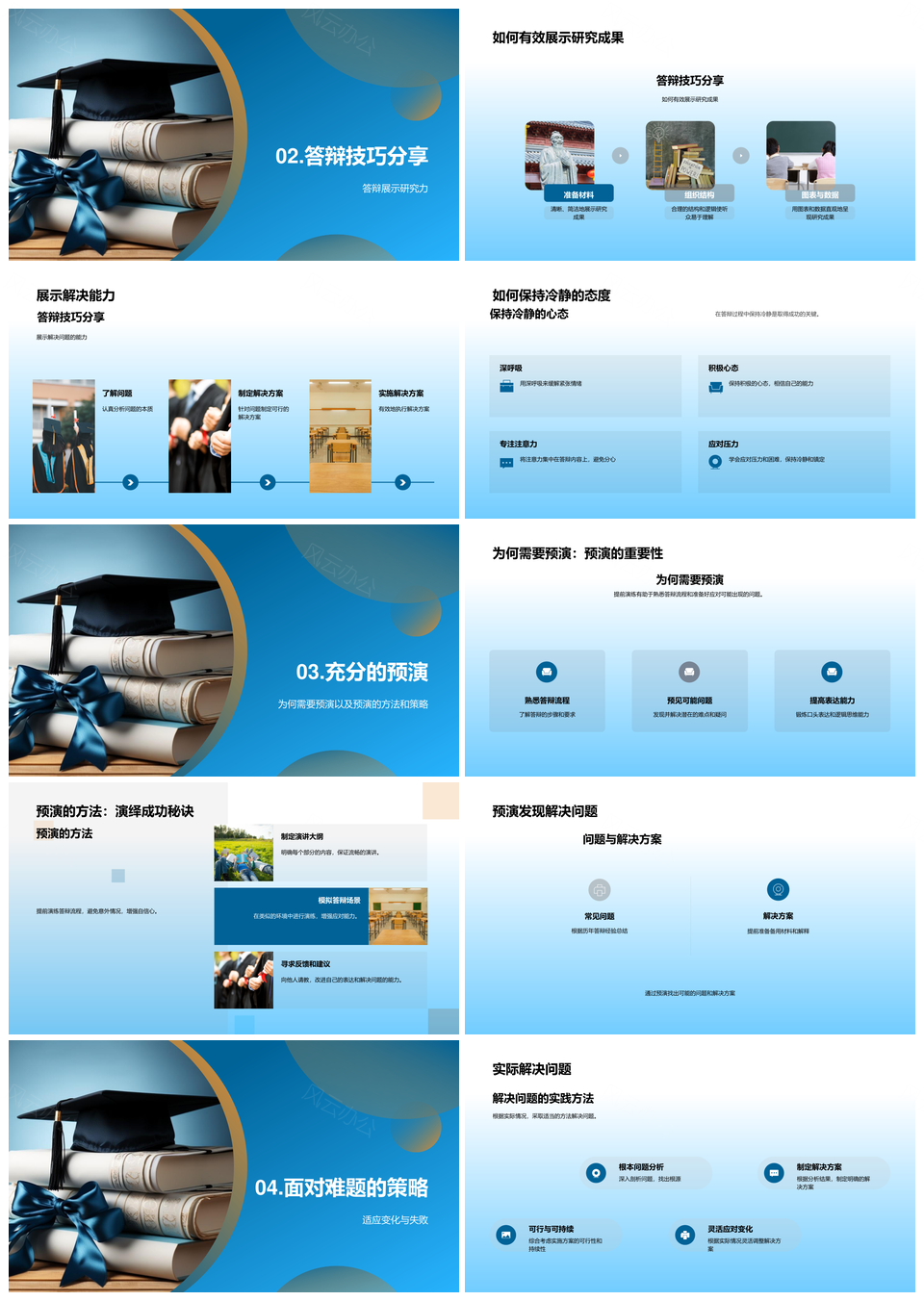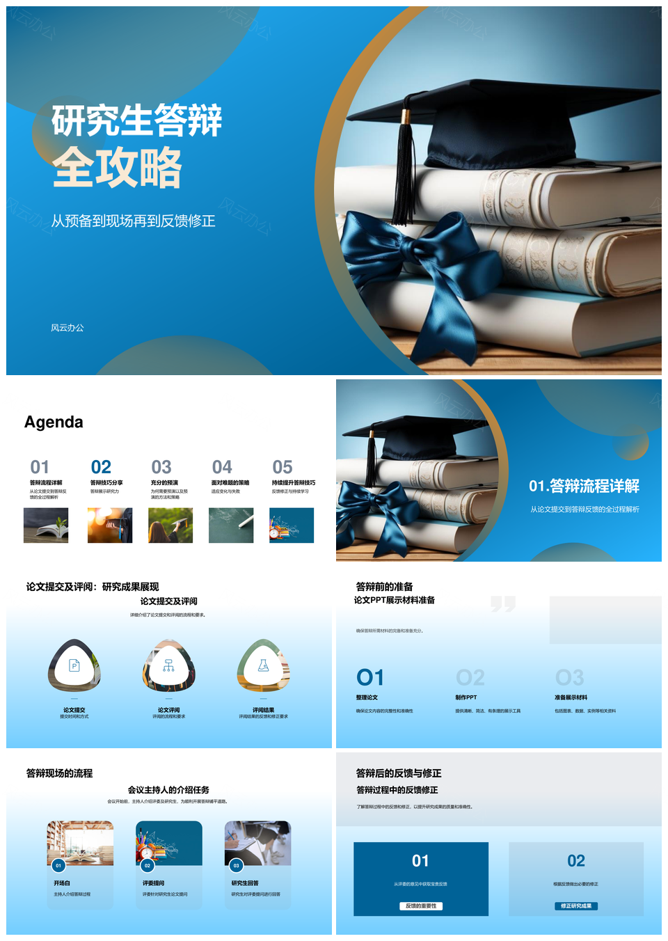 风云办公提供的研究生答辩流程技巧预演反馈论文评阅PPT模板,下载格式为pptx,一共24页,作品中文字及图均可以修改和编辑,图片更改请在作品中右键图片并更换,文字修改请直接点击文字进行修改。