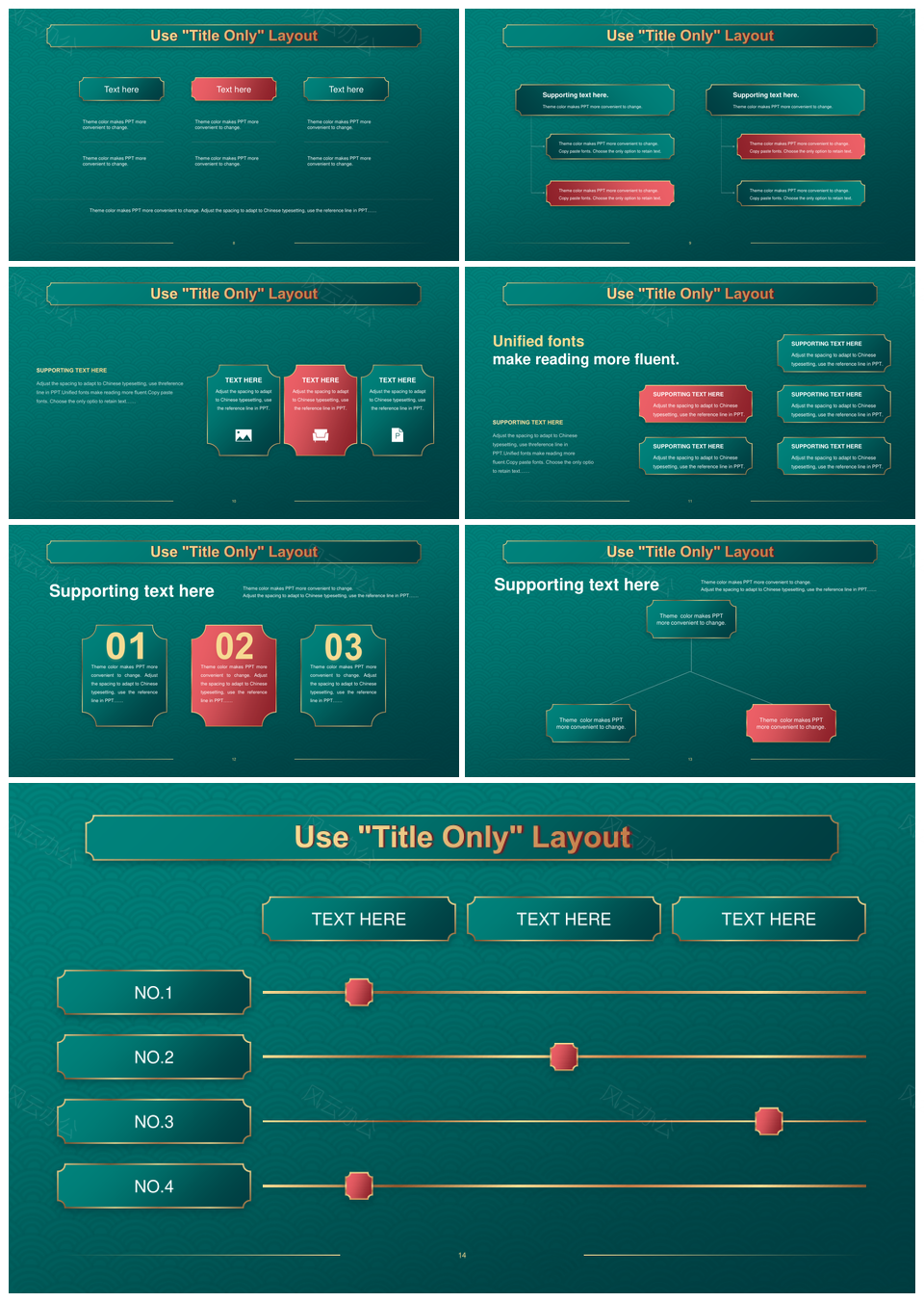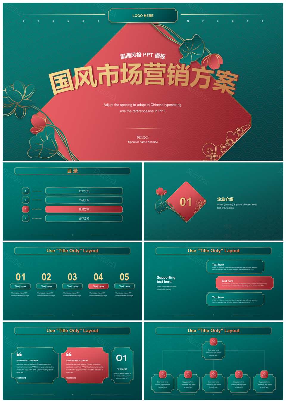 这款模板以中国传统色谱为灵感,选取正红与墨绿为核心色调,金色点缀细节,浅绿平衡视觉层次,融入手绘水墨笔触与留白技法,营造东方意境。画面通过国风背景,强化纸张肌理,主视觉的红绿对比克制且协调,避免艳俗感,适配文化讲解、艺术赏析及品牌提案等场景。图形元素以山水、花卉为主,线条疏密有致,兼顾现代商务的简洁与传统美学的雅致,提供可延展的视觉框架。