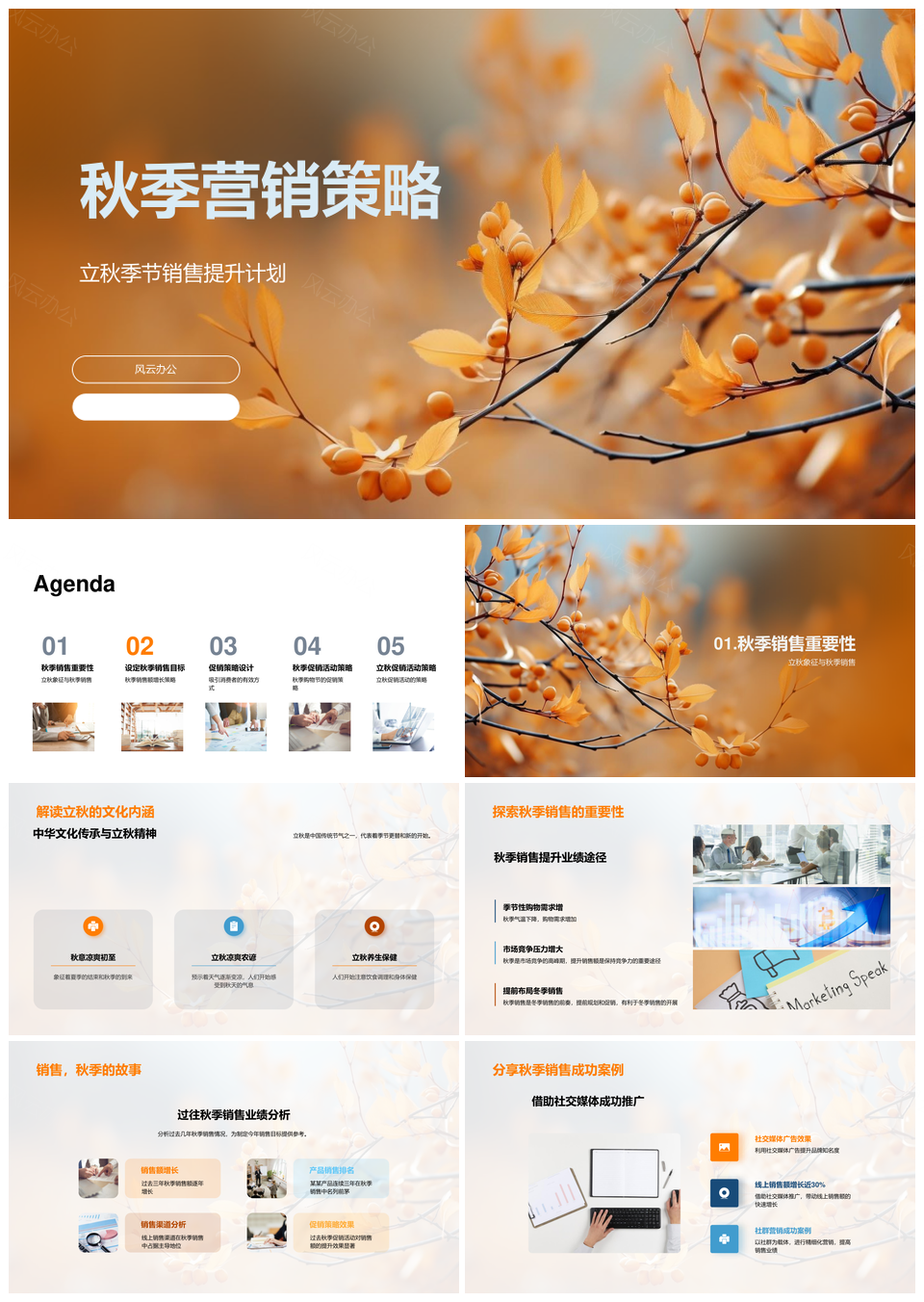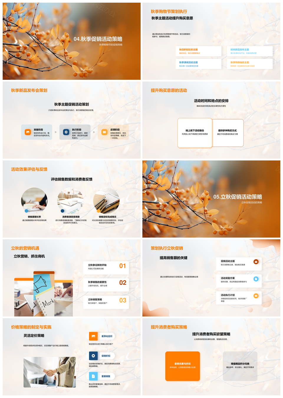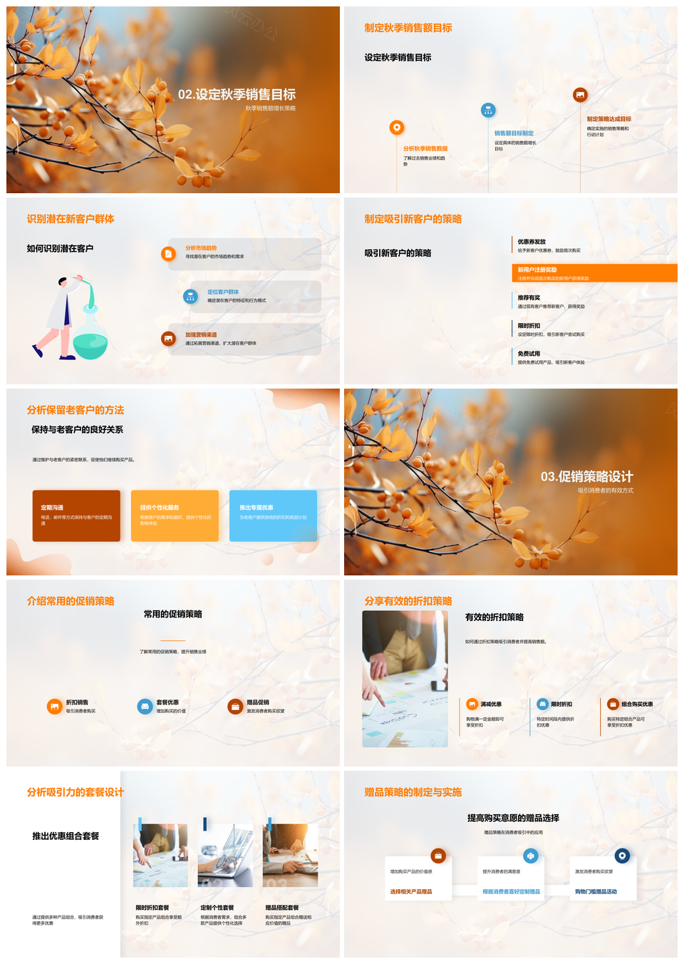 这是一张立秋金秋营销策略提升业绩新老客户促销策略PPT模板,包含立秋、金秋、营销策略、提升、业绩、新老客户、促销策略等主题内容,也可用作立秋金秋营销策略提升业绩、金秋营销策略提升业绩、营销策略提升业绩新老客户、提升业绩新老客户促销策略、立秋金秋新老客户促销策略、金秋营销策略提升、营销策略提升业绩、提升业绩新老客户、新老客户促销策略、立秋金秋促销策略、立秋金秋营销策略、金秋提升业绩新老客户、营销策略新老客户促销、提升促销策略业绩、立秋金秋提升业绩等PPT场景使用。 风云办公提供的立秋金秋营销策略提升业绩新老客户促销策略PPT模板,下载格式为pptx,一共28页,作品中文字及图均可以修改和编辑,图片更改请在作品中右键图片并更换,文字修改请直接点击文字进行修改。