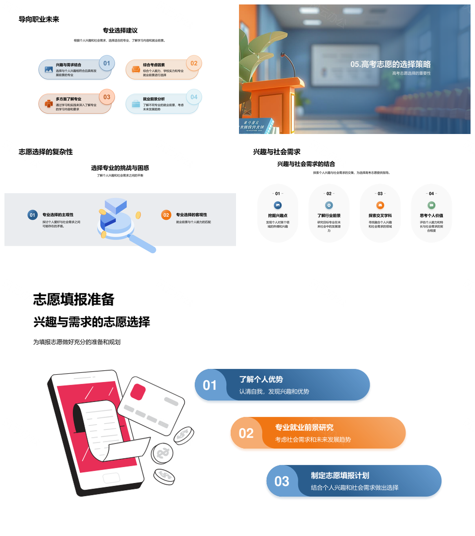 这是一张高考志愿填报指南策略PPT模板,包含高考、志愿、填报、指南、策略等主题内容,也可用作高考志愿填报指南、高考志愿填报策略、志愿填报指南策略、高考志愿填报、志愿填报指南、填报指南策略、高考志愿策略、志愿填报策略、高考志愿指南、高考指南策略、高考志愿、志愿填报、填报指南、指南策略、高考策略等PPT场景使用。 风云办公提供的高考志愿填报指南策略PPT模板,下载格式为pptx,一共23页,作品中文字及图均可以修改和编辑,图片更改请在作品中右键图片并更换,文字修改请直接点击文字进行修改。