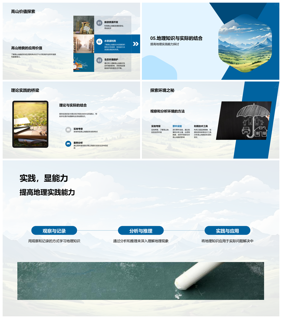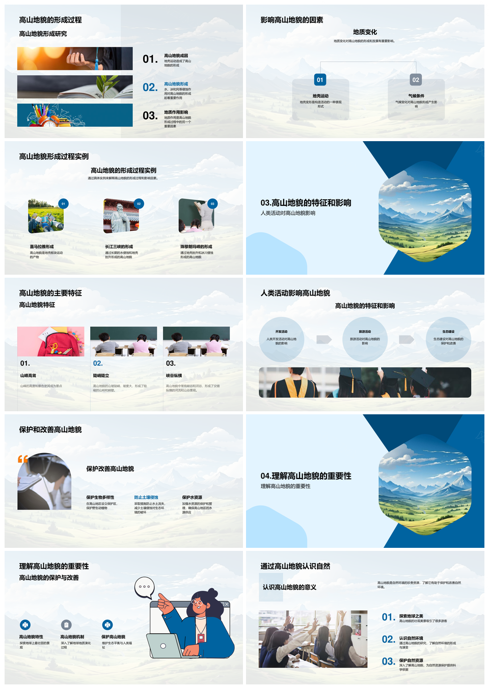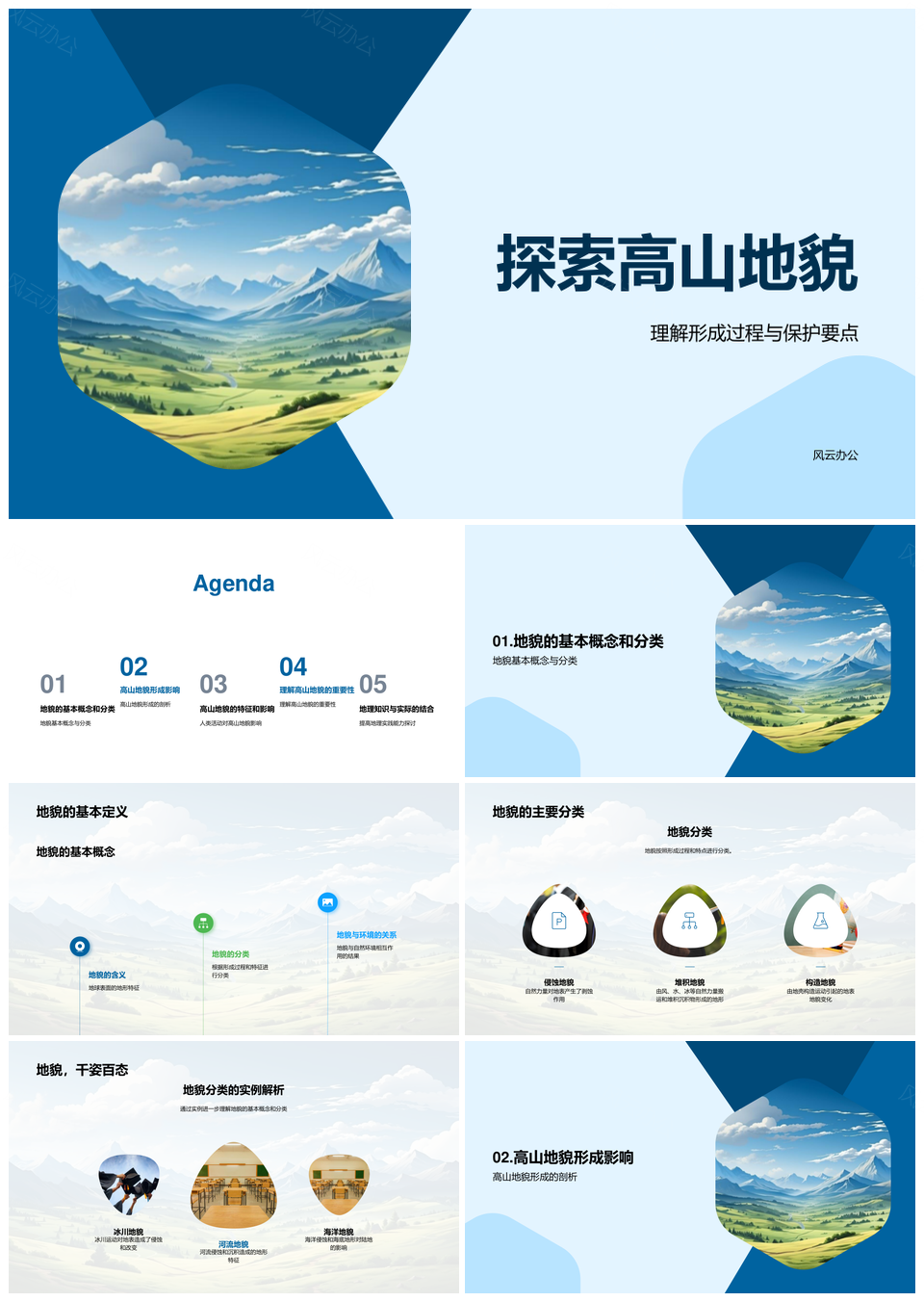 风云办公提供的高山地貌形成保护分类影响与教学实践PPT模板,下载格式为pptx,一共23页,作品中文字及图均可以修改和编辑,图片更改请在作品中右键图片并更换,文字修改请直接点击文字进行修改。