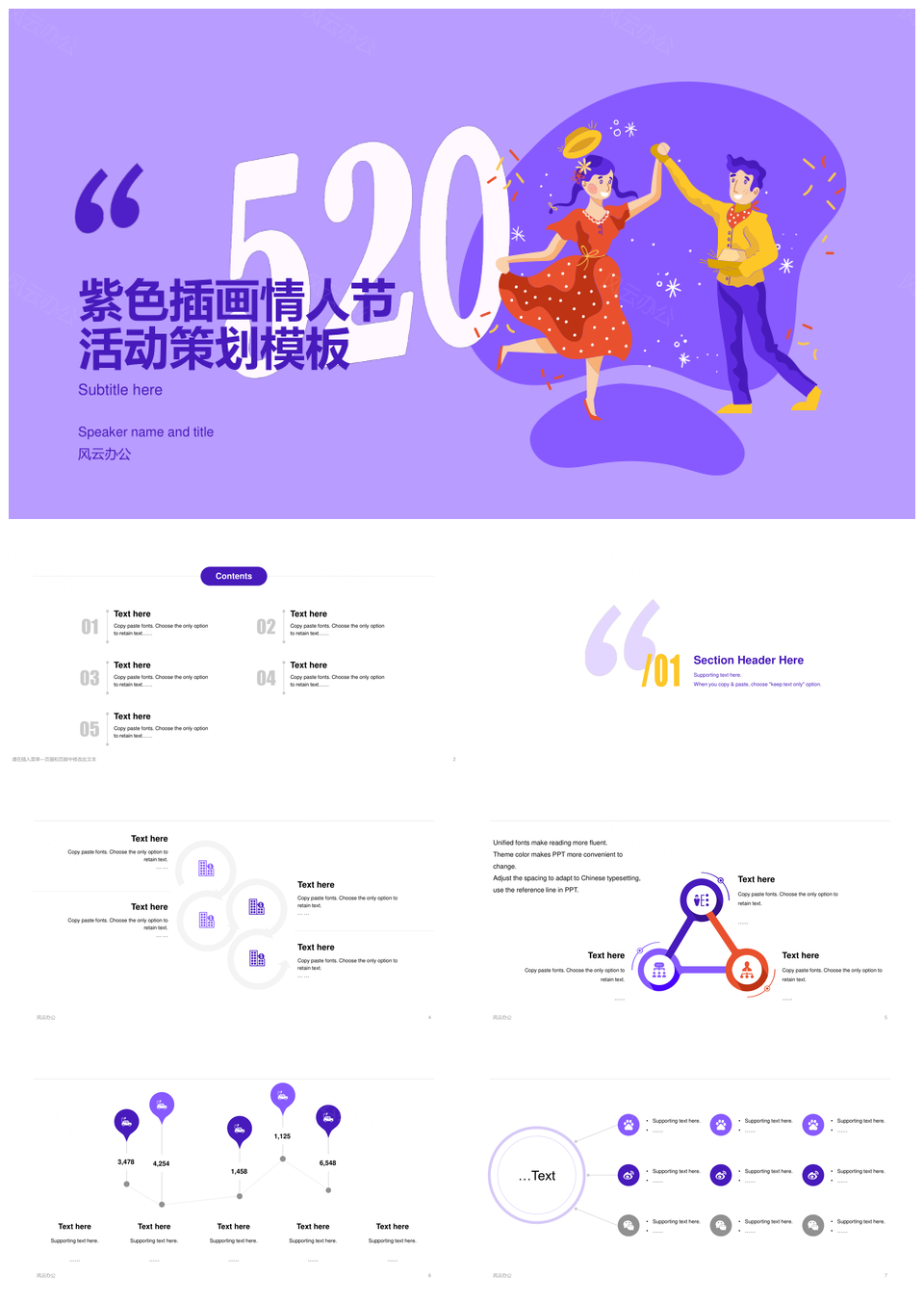 紫色插画520情侣浪漫烟花表白日主题PPT模板