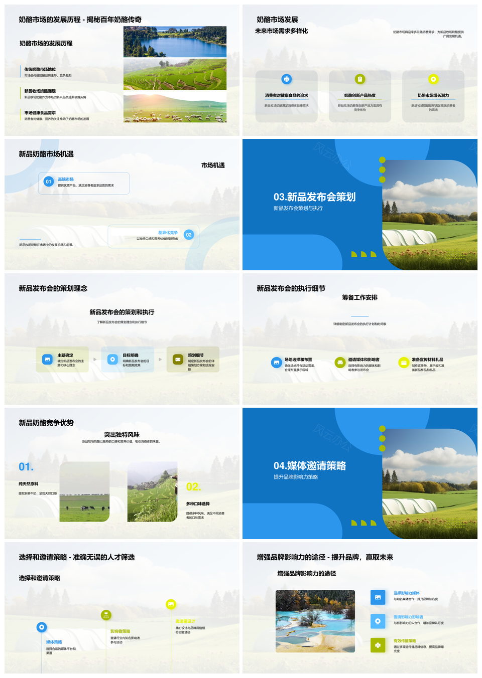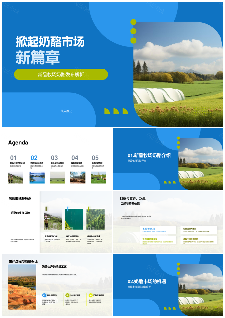 风云办公提供的牧场奶酪新品发布会领航市场机遇PPT模板,下载格式为pptx,一共23页,作品中文字及图均可以修改和编辑,图片更改请在作品中右键图片并更换,文字修改请直接点击文字进行修改。