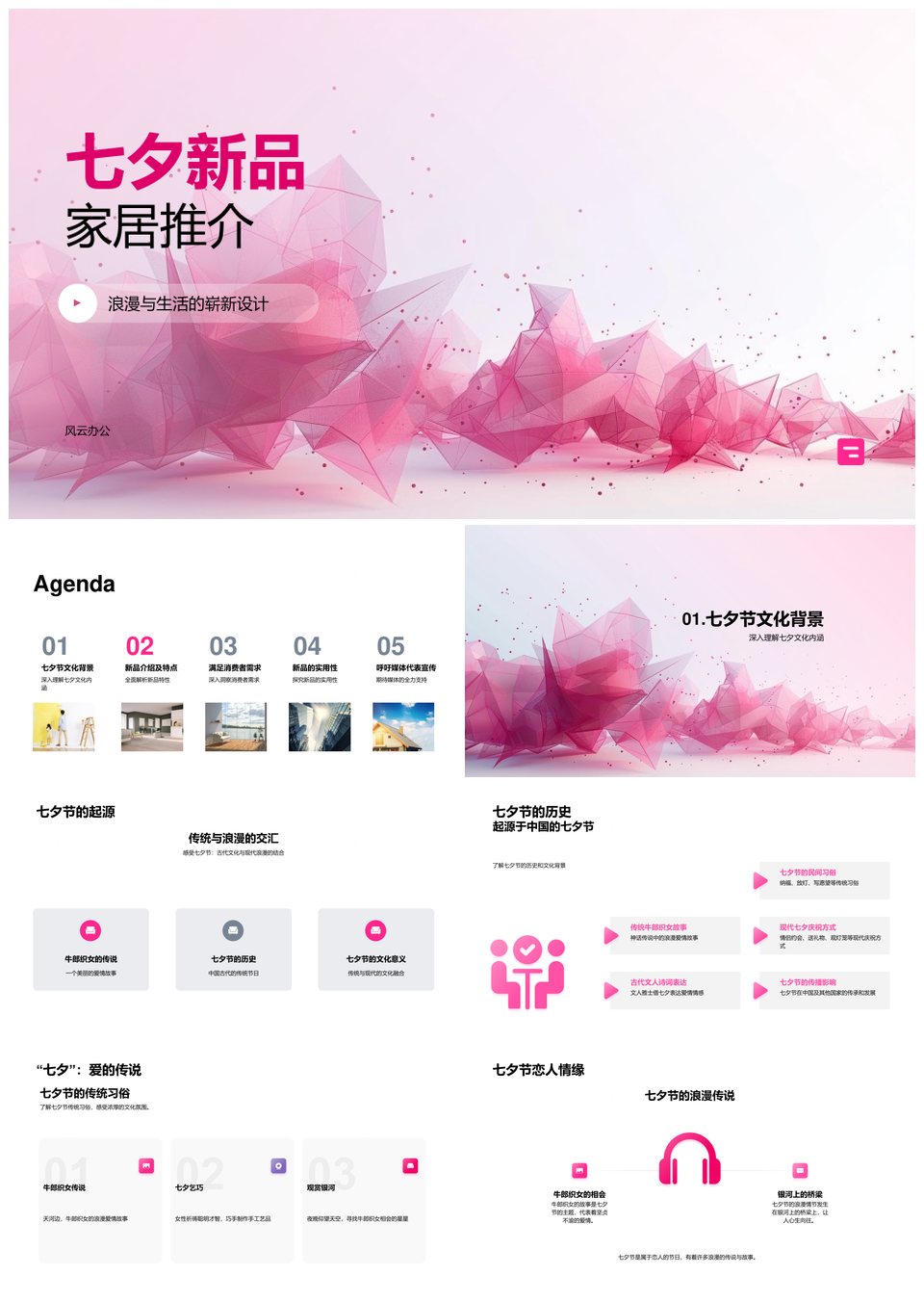 风云办公提供的七夕家居新品实用设计传承传统习俗PPT模板,下载格式为pptx,一共25页,作品中文字及图均可以修改和编辑,图片更改请在作品中右键图片并更换,文字修改请直接点击文字进行修改。