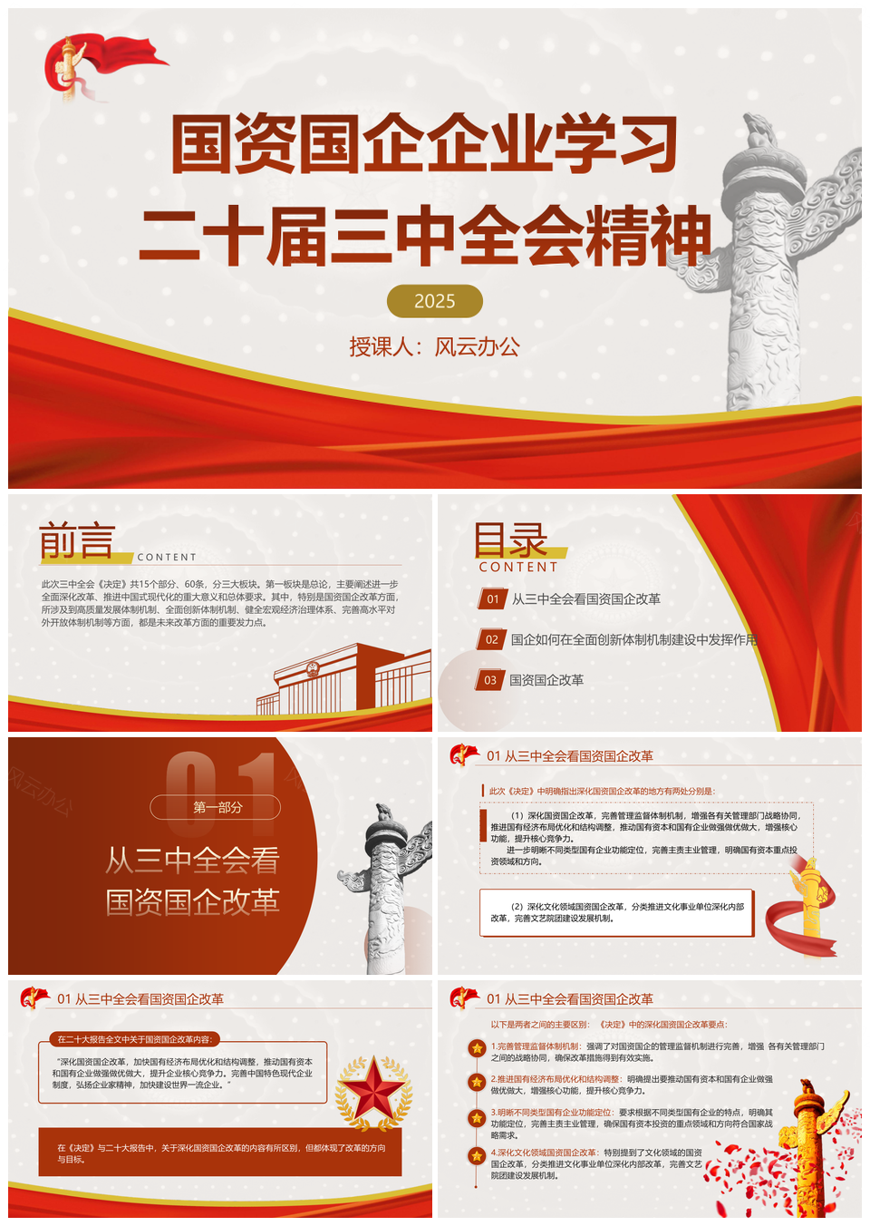 这是一张2025国资国企企业学习二十届三中全会精神PPT模板,包含2025、国资、国企、企业、学习、二十届三中全会、精神等主题内容,也可用作学习二十届三中全会精神、国资国企学习精神、企业学习三中全会精神、二十届三中全会精神、学习三中全会精神、国资国企学习、国企企业学习、2025国资国企、国资学习精神、企业学习精神、国资国企企业、国资国企、国企企业、学习精神、二十届三中全会等PPT场景使用。 风云办公提供的2025国资国企企业学习二十届三中全会精神PPT模板,下载格式为pptx,一共26页,作品中文字及图均可以修改和编辑,图片更改请在作品中右键图片并更换,文字修改请直接点击文字进行修改。