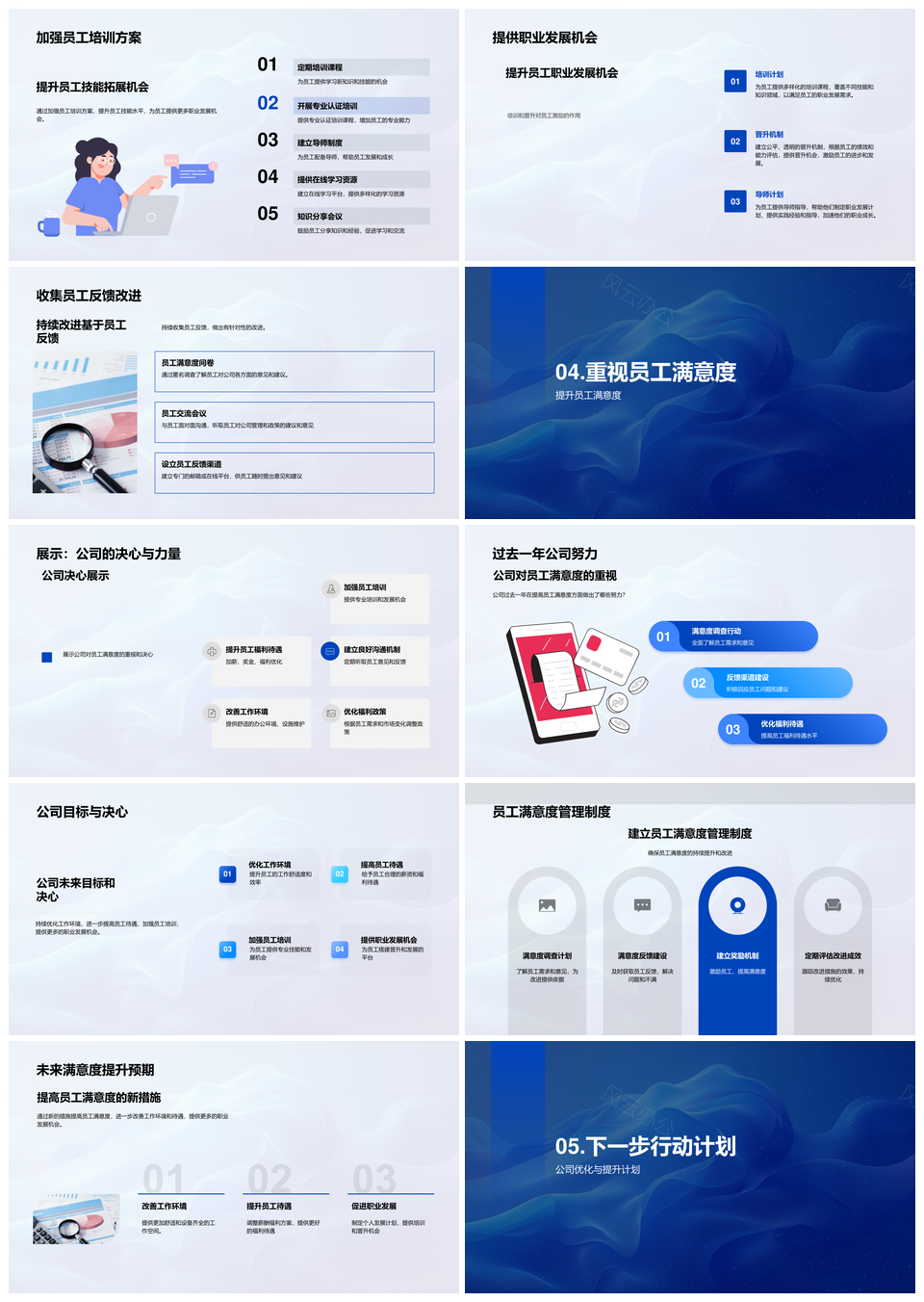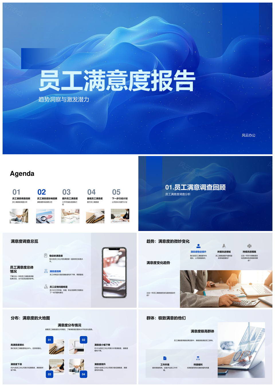 风云办公提供的员工满意度趋势洞察激发潜力报告PPT模板,下载格式为pptx,一共33页,作品中文字及图均可以修改和编辑,图片更改请在作品中右键图片并更换,文字修改请直接点击文字进行修改。