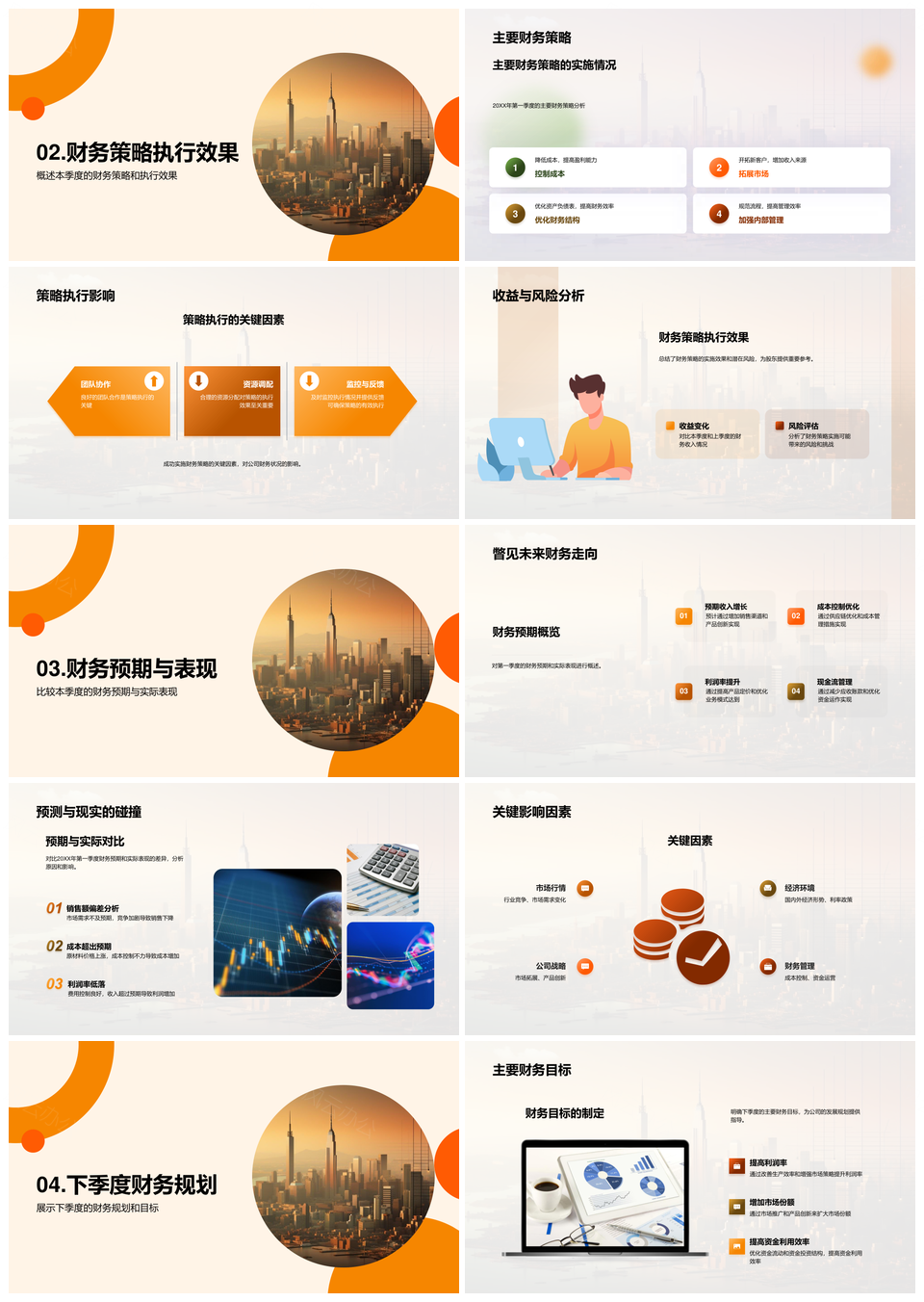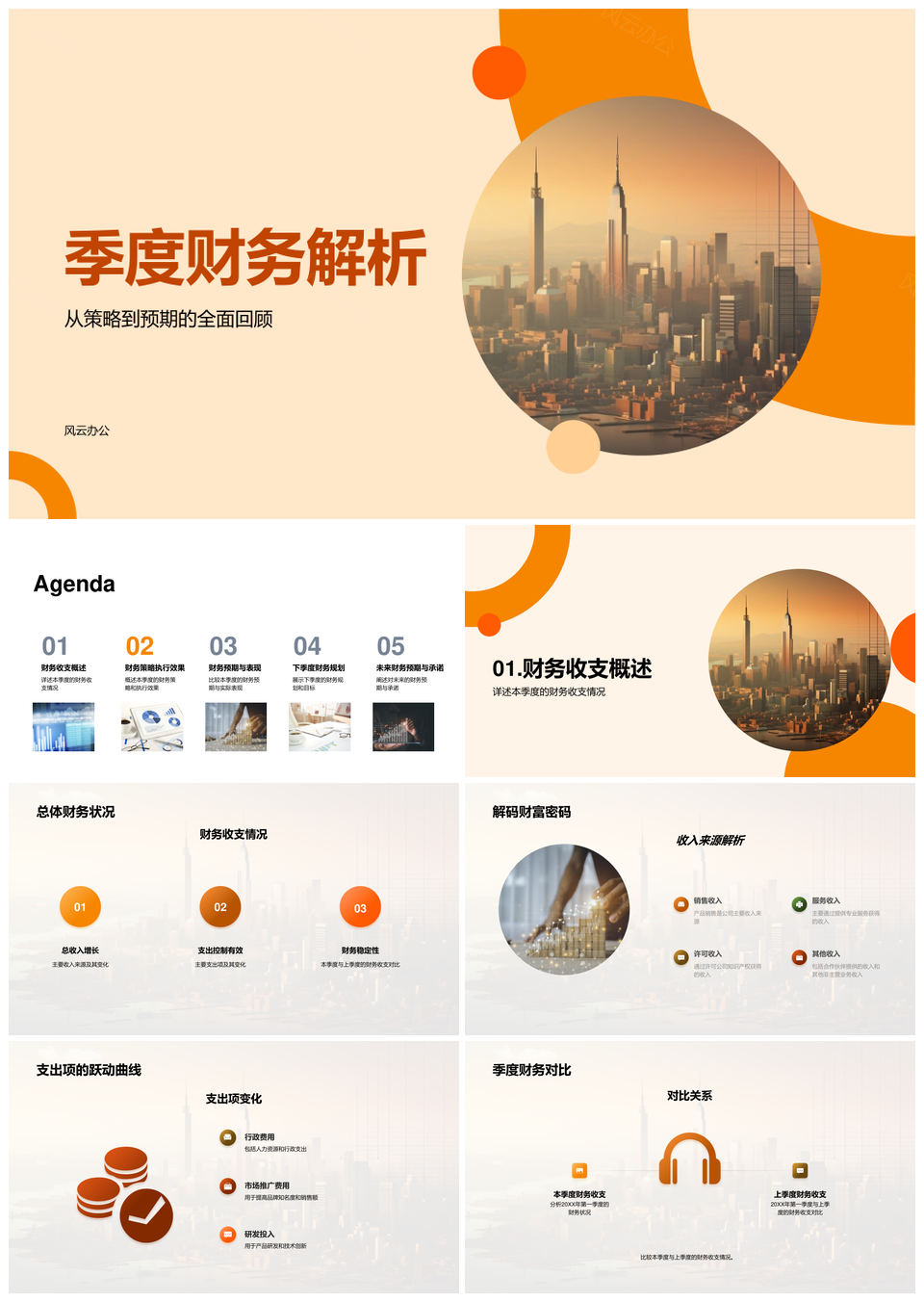 风云办公提供的季度财务收支策略成效与结构优化规划PPT模板,下载格式为pptx,一共25页,作品中文字及图均可以修改和编辑,图片更改请在作品中右键图片并更换,文字修改请直接点击文字进行修改。